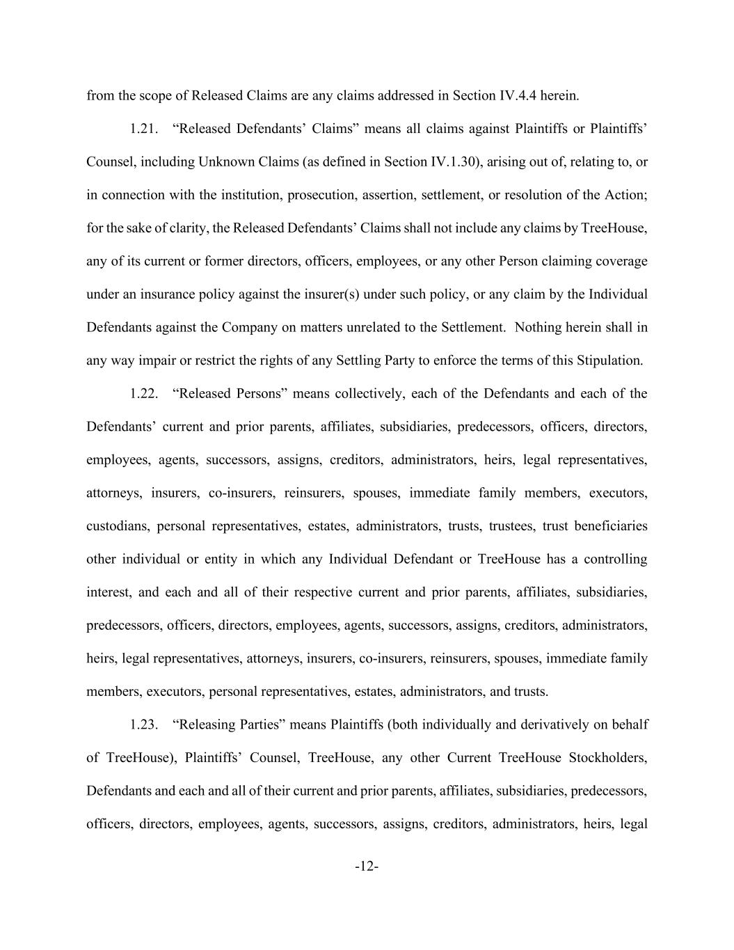 -12- from the scope of Released Claims are any claims addressed in Section IV.4.4 herein. 1.21. “Released Defendants’ Claims” means all claims against Plaintiffs or Plaintiffs’ Counsel, including Unknown Claims (as defined in Section IV.1.30), arising out of, relating to, or in connection with the institution, prosecution, assertion, settlement, or resolution of the Action; for the sake of clarity, the Released Defendants’ Claims shall not include any claims by TreeHouse, any of its current or former directors, officers, employees, or any other Person claiming coverage under an insurance policy against the insurer(s) under such policy, or any claim by the Individual Defendants against the Company on matters unrelated to the Settlement. Nothing herein shall in any way impair or restrict the rights of any Settling Party to enforce the terms of this Stipulation. 1.22. “Released Persons” means collectively, each of the Defendants and each of the Defendants’ current and prior parents, affiliates, subsidiaries, predecessors, officers, directors, employees, agents, successors, assigns, creditors, administrators, heirs, legal representatives, attorneys, insurers, co-insurers, reinsurers, spouses, immediate family members, executors, custodians, personal representatives, estates, administrators, trusts, trustees, trust beneficiaries other individual or entity in which any Individual Defendant or TreeHouse has a controlling interest, and each and all of their respective current and prior parents, affiliates, subsidiaries, predecessors, officers, directors, employees, agents, successors, assigns, creditors, administrators, heirs, legal representatives, attorneys, insurers, co-insurers, reinsurers, spouses, immediate family members, executors, personal representatives, estates, administrators, and trusts. 1.23. “Releasing Parties” means Plaintiffs (both individually and derivatively on behalf of TreeHouse), Plaintiffs’ Counsel, TreeHouse, any other Current TreeHouse Stockholders, Defendants and each and all of their current and prior parents, affiliates, subsidiaries, predecessors, officers, directors, employees, agents, successors, assigns, creditors, administrators, heirs, legal