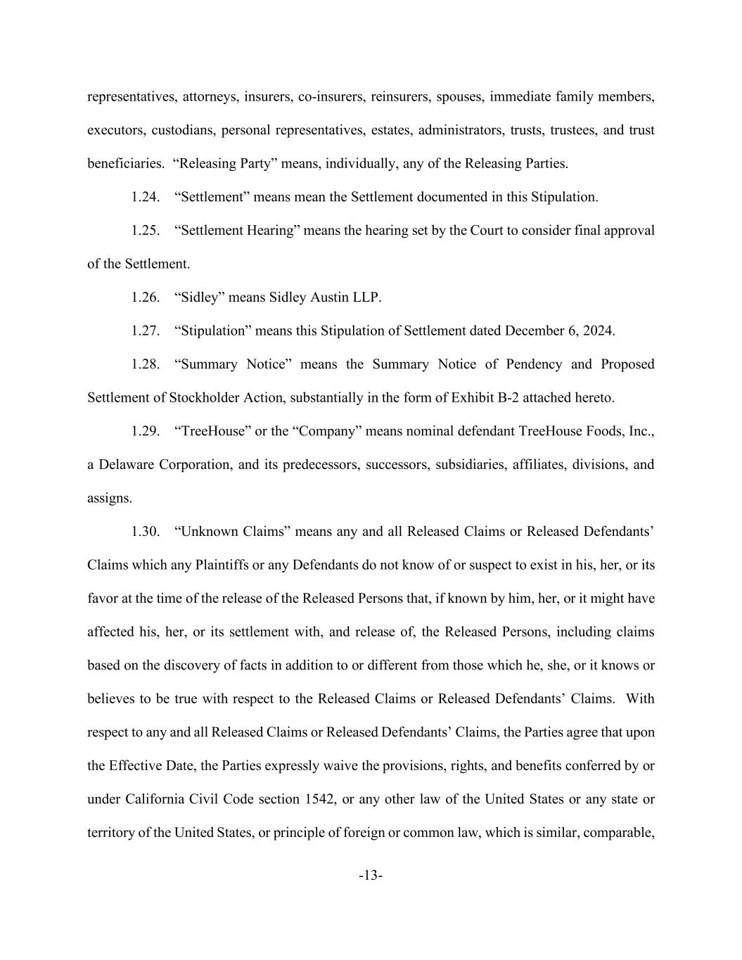 -13- representatives, attorneys, insurers, co-insurers, reinsurers, spouses, immediate family members, executors, custodians, personal representatives, estates, administrators, trusts, trustees, and trust beneficiaries. “Releasing Party” means, individually, any of the Releasing Parties. 1.24. “Settlement” means mean the Settlement documented in this Stipulation. 1.25. “Settlement Hearing” means the hearing set by the Court to consider final approval of the Settlement. 1.26. “Sidley” means Sidley Austin LLP. 1.27. “Stipulation” means this Stipulation of Settlement dated December 6, 2024. 1.28. “Summary Notice” means the Summary Notice of Pendency and Proposed Settlement of Stockholder Action, substantially in the form of Exhibit B-2 attached hereto. 1.29. “TreeHouse” or the “Company” means nominal defendant TreeHouse Foods, Inc., a Delaware Corporation, and its predecessors, successors, subsidiaries, affiliates, divisions, and assigns. 1.30. “Unknown Claims” means any and all Released Claims or Released Defendants’ Claims which any Plaintiffs or any Defendants do not know of or suspect to exist in his, her, or its favor at the time of the release of the Released Persons that, if known by him, her, or it might have affected his, her, or its settlement with, and release of, the Released Persons, including claims based on the discovery of facts in addition to or different from those which he, she, or it knows or believes to be true with respect to the Released Claims or Released Defendants’ Claims. With respect to any and all Released Claims or Released Defendants’ Claims, the Parties agree that upon the Effective Date, the Parties expressly waive the provisions, rights, and benefits conferred by or under California Civil Code section 1542, or any other law of the United States or any state or territory of the United States, or principle of foreign or common law, which is similar, comparable,
