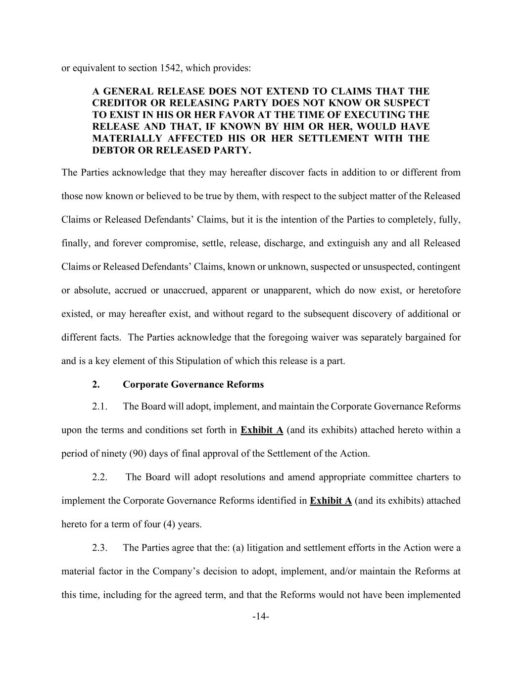 -14- or equivalent to section 1542, which provides: A GENERAL RELEASE DOES NOT EXTEND TO CLAIMS THAT THE CREDITOR OR RELEASING PARTY DOES NOT KNOW OR SUSPECT TO EXIST IN HIS OR HER FAVOR AT THE TIME OF EXECUTING THE RELEASE AND THAT, IF KNOWN BY HIM OR HER, WOULD HAVE MATERIALLY AFFECTED HIS OR HER SETTLEMENT WITH THE DEBTOR OR RELEASED PARTY. The Parties acknowledge that they may hereafter discover facts in addition to or different from those now known or believed to be true by them, with respect to the subject matter of the Released Claims or Released Defendants’ Claims, but it is the intention of the Parties to completely, fully, finally, and forever compromise, settle, release, discharge, and extinguish any and all Released Claims or Released Defendants’ Claims, known or unknown, suspected or unsuspected, contingent or absolute, accrued or unaccrued, apparent or unapparent, which do now exist, or heretofore existed, or may hereafter exist, and without regard to the subsequent discovery of additional or different facts. The Parties acknowledge that the foregoing waiver was separately bargained for and is a key element of this Stipulation of which this release is a part. 2. Corporate Governance Reforms 2.1. The Board will adopt, implement, and maintain the Corporate Governance Reforms upon the terms and conditions set forth in Exhibit A (and its exhibits) attached hereto within a period of ninety (90) days of final approval of the Settlement of the Action. 2.2. The Board will adopt resolutions and amend appropriate committee charters to implement the Corporate Governance Reforms identified in Exhibit A (and its exhibits) attached hereto for a term of four (4) years. 2.3. The Parties agree that the: (a) litigation and settlement efforts in the Action were a material factor in the Company’s decision to adopt, implement, and/or maintain the Reforms at this time, including for the agreed term, and that the Reforms would not have been implemented