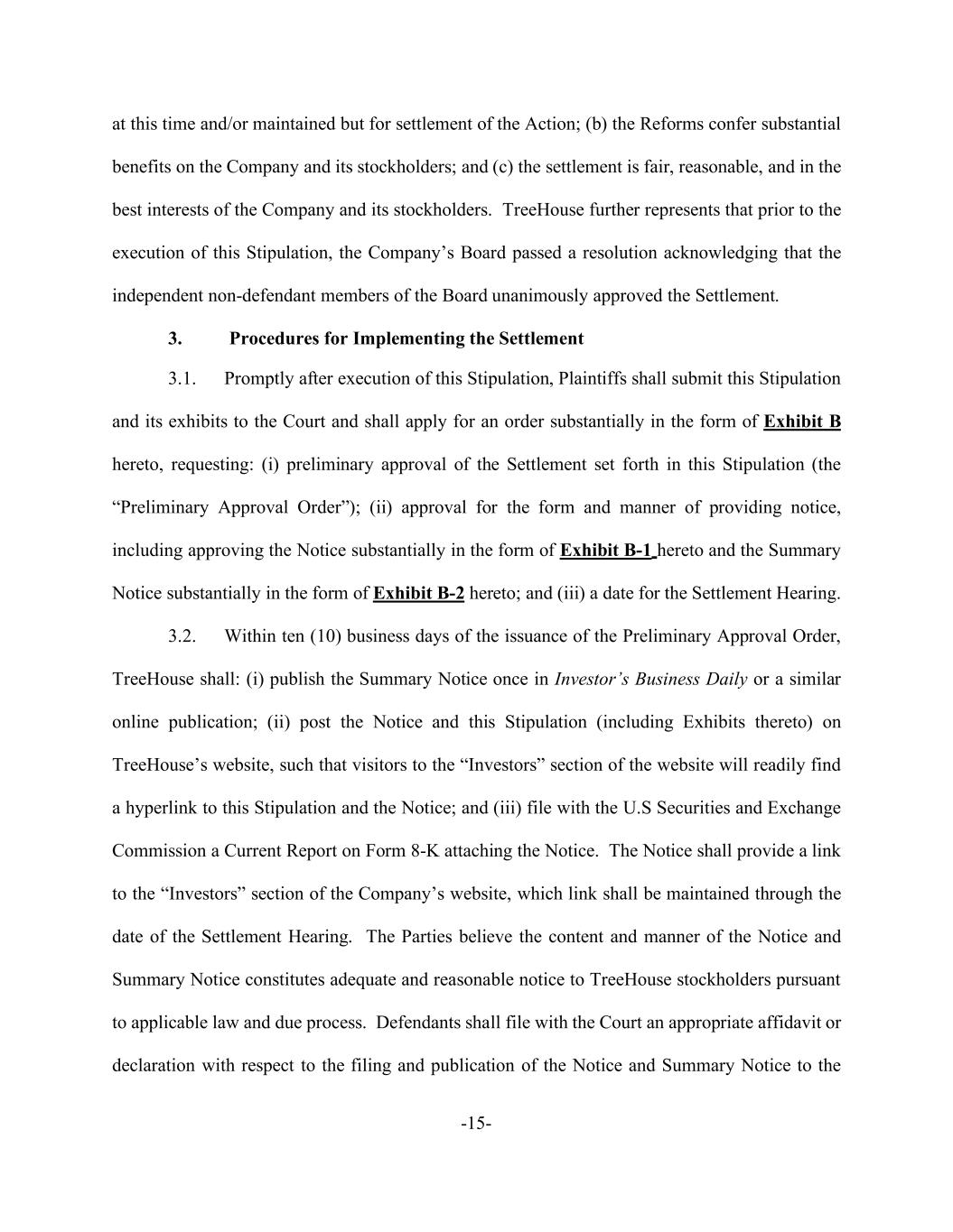 -15- at this time and/or maintained but for settlement of the Action; (b) the Reforms confer substantial benefits on the Company and its stockholders; and (c) the settlement is fair, reasonable, and in the best interests of the Company and its stockholders. TreeHouse further represents that prior to the execution of this Stipulation, the Company’s Board passed a resolution acknowledging that the independent non-defendant members of the Board unanimously approved the Settlement. 3. Procedures for Implementing the Settlement 3.1. Promptly after execution of this Stipulation, Plaintiffs shall submit this Stipulation and its exhibits to the Court and shall apply for an order substantially in the form of Exhibit B hereto, requesting: (i) preliminary approval of the Settlement set forth in this Stipulation (the “Preliminary Approval Order”); (ii) approval for the form and manner of providing notice, including approving the Notice substantially in the form of Exhibit B-1 hereto and the Summary Notice substantially in the form of Exhibit B-2 hereto; and (iii) a date for the Settlement Hearing. 3.2. Within ten (10) business days of the issuance of the Preliminary Approval Order, TreeHouse shall: (i) publish the Summary Notice once in Investor’s Business Daily or a similar online publication; (ii) post the Notice and this Stipulation (including Exhibits thereto) on TreeHouse’s website, such that visitors to the “Investors” section of the website will readily find a hyperlink to this Stipulation and the Notice; and (iii) file with the U.S Securities and Exchange Commission a Current Report on Form 8-K attaching the Notice. The Notice shall provide a link to the “Investors” section of the Company’s website, which link shall be maintained through the date of the Settlement Hearing. The Parties believe the content and manner of the Notice and Summary Notice constitutes adequate and reasonable notice to TreeHouse stockholders pursuant to applicable law and due process. Defendants shall file with the Court an appropriate affidavit or declaration with respect to the filing and publication of the Notice and Summary Notice to the