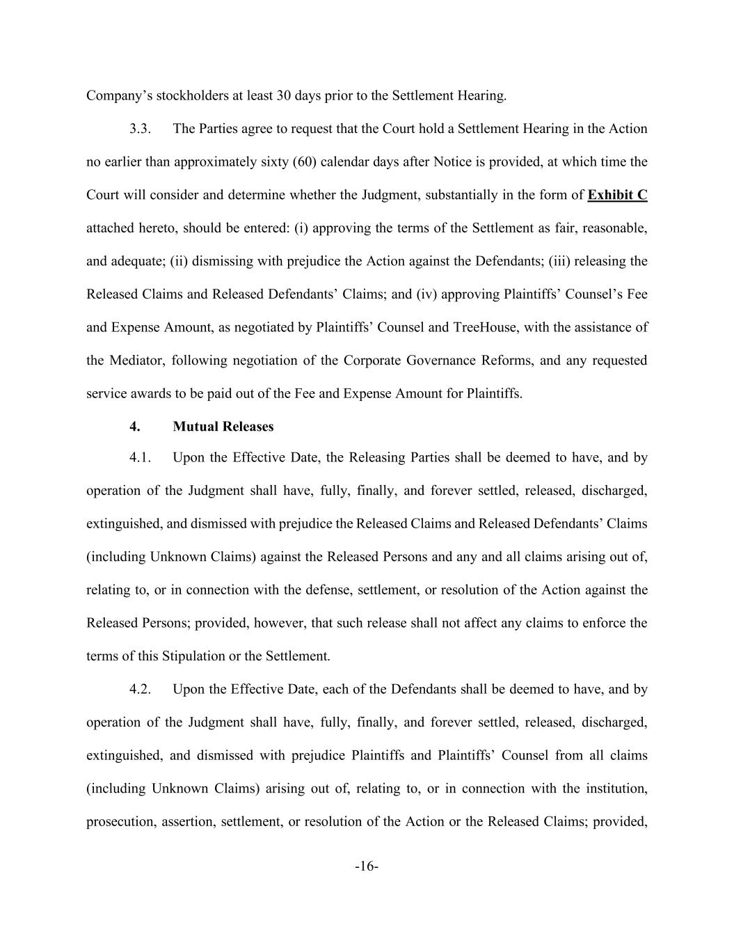 -16- Company’s stockholders at least 30 days prior to the Settlement Hearing. 3.3. The Parties agree to request that the Court hold a Settlement Hearing in the Action no earlier than approximately sixty (60) calendar days after Notice is provided, at which time the Court will consider and determine whether the Judgment, substantially in the form of Exhibit C attached hereto, should be entered: (i) approving the terms of the Settlement as fair, reasonable, and adequate; (ii) dismissing with prejudice the Action against the Defendants; (iii) releasing the Released Claims and Released Defendants’ Claims; and (iv) approving Plaintiffs’ Counsel’s Fee and Expense Amount, as negotiated by Plaintiffs’ Counsel and TreeHouse, with the assistance of the Mediator, following negotiation of the Corporate Governance Reforms, and any requested service awards to be paid out of the Fee and Expense Amount for Plaintiffs. 4. Mutual Releases 4.1. Upon the Effective Date, the Releasing Parties shall be deemed to have, and by operation of the Judgment shall have, fully, finally, and forever settled, released, discharged, extinguished, and dismissed with prejudice the Released Claims and Released Defendants’ Claims (including Unknown Claims) against the Released Persons and any and all claims arising out of, relating to, or in connection with the defense, settlement, or resolution of the Action against the Released Persons; provided, however, that such release shall not affect any claims to enforce the terms of this Stipulation or the Settlement. 4.2. Upon the Effective Date, each of the Defendants shall be deemed to have, and by operation of the Judgment shall have, fully, finally, and forever settled, released, discharged, extinguished, and dismissed with prejudice Plaintiffs and Plaintiffs’ Counsel from all claims (including Unknown Claims) arising out of, relating to, or in connection with the institution, prosecution, assertion, settlement, or resolution of the Action or the Released Claims; provided,