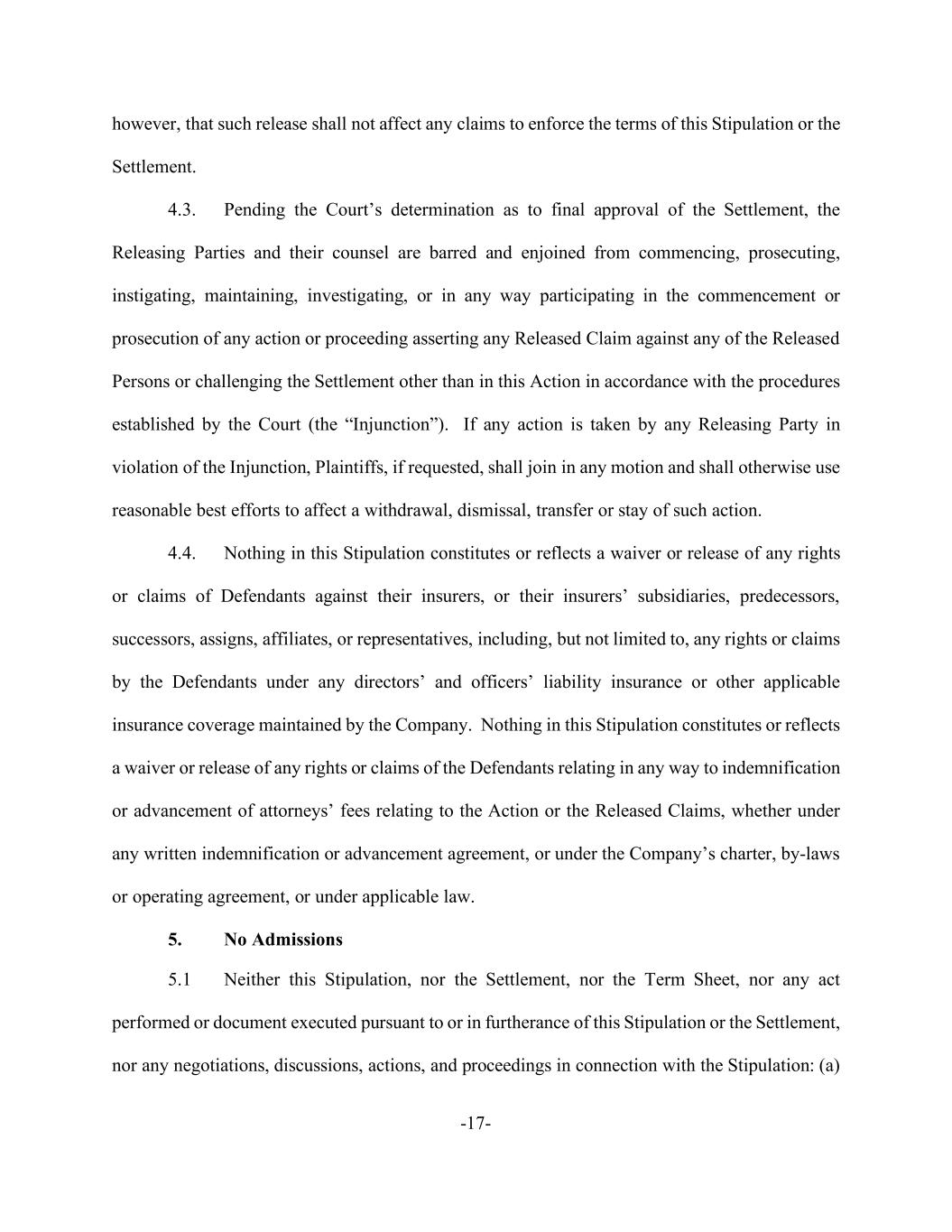 -17- however, that such release shall not affect any claims to enforce the terms of this Stipulation or the Settlement. 4.3. Pending the Court’s determination as to final approval of the Settlement, the Releasing Parties and their counsel are barred and enjoined from commencing, prosecuting, instigating, maintaining, investigating, or in any way participating in the commencement or prosecution of any action or proceeding asserting any Released Claim against any of the Released Persons or challenging the Settlement other than in this Action in accordance with the procedures established by the Court (the “Injunction”). If any action is taken by any Releasing Party in violation of the Injunction, Plaintiffs, if requested, shall join in any motion and shall otherwise use reasonable best efforts to affect a withdrawal, dismissal, transfer or stay of such action. 4.4. Nothing in this Stipulation constitutes or reflects a waiver or release of any rights or claims of Defendants against their insurers, or their insurers’ subsidiaries, predecessors, successors, assigns, affiliates, or representatives, including, but not limited to, any rights or claims by the Defendants under any directors’ and officers’ liability insurance or other applicable insurance coverage maintained by the Company. Nothing in this Stipulation constitutes or reflects a waiver or release of any rights or claims of the Defendants relating in any way to indemnification or advancement of attorneys’ fees relating to the Action or the Released Claims, whether under any written indemnification or advancement agreement, or under the Company’s charter, by-laws or operating agreement, or under applicable law. 5. No Admissions 5.1 Neither this Stipulation, nor the Settlement, nor the Term Sheet, nor any act performed or document executed pursuant to or in furtherance of this Stipulation or the Settlement, nor any negotiations, discussions, actions, and proceedings in connection with the Stipulation: (a)