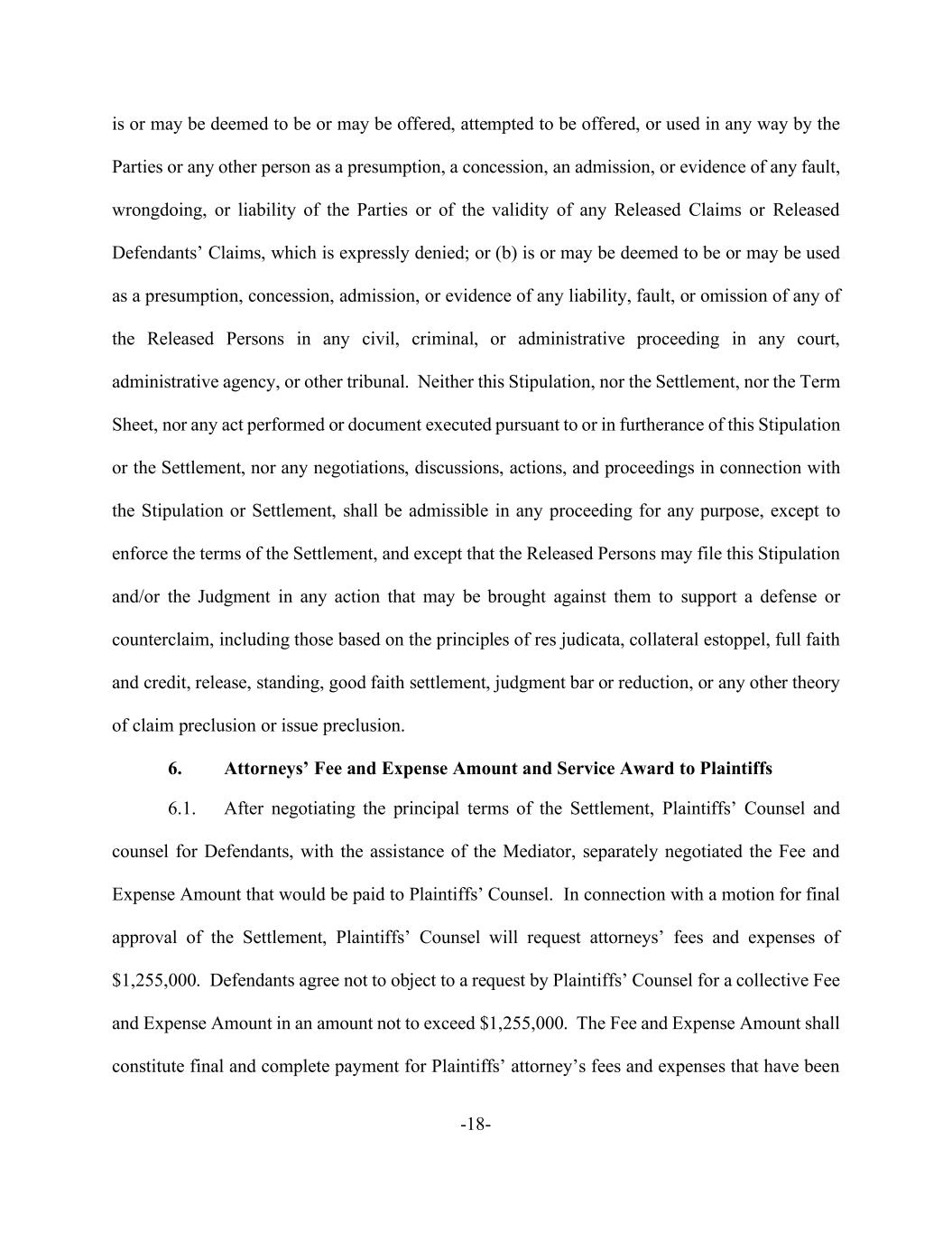 -18- is or may be deemed to be or may be offered, attempted to be offered, or used in any way by the Parties or any other person as a presumption, a concession, an admission, or evidence of any fault, wrongdoing, or liability of the Parties or of the validity of any Released Claims or Released Defendants’ Claims, which is expressly denied; or (b) is or may be deemed to be or may be used as a presumption, concession, admission, or evidence of any liability, fault, or omission of any of the Released Persons in any civil, criminal, or administrative proceeding in any court, administrative agency, or other tribunal. Neither this Stipulation, nor the Settlement, nor the Term Sheet, nor any act performed or document executed pursuant to or in furtherance of this Stipulation or the Settlement, nor any negotiations, discussions, actions, and proceedings in connection with the Stipulation or Settlement, shall be admissible in any proceeding for any purpose, except to enforce the terms of the Settlement, and except that the Released Persons may file this Stipulation and/or the Judgment in any action that may be brought against them to support a defense or counterclaim, including those based on the principles of res judicata, collateral estoppel, full faith and credit, release, standing, good faith settlement, judgment bar or reduction, or any other theory of claim preclusion or issue preclusion. 6. Attorneys’ Fee and Expense Amount and Service Award to Plaintiffs 6.1. After negotiating the principal terms of the Settlement, Plaintiffs’ Counsel and counsel for Defendants, with the assistance of the Mediator, separately negotiated the Fee and Expense Amount that would be paid to Plaintiffs’ Counsel. In connection with a motion for final approval of the Settlement, Plaintiffs’ Counsel will request attorneys’ fees and expenses of $1,255,000. Defendants agree not to object to a request by Plaintiffs’ Counsel for a collective Fee and Expense Amount in an amount not to exceed $1,255,000. The Fee and Expense Amount shall constitute final and complete payment for Plaintiffs’ attorney’s fees and expenses that have been