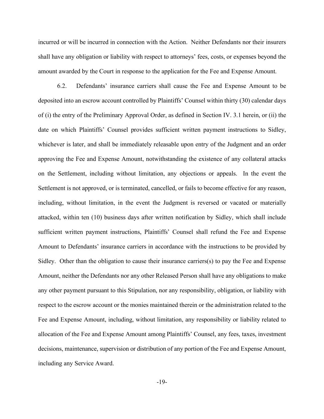 -19- incurred or will be incurred in connection with the Action. Neither Defendants nor their insurers shall have any obligation or liability with respect to attorneys’ fees, costs, or expenses beyond the amount awarded by the Court in response to the application for the Fee and Expense Amount. 6.2. Defendants’ insurance carriers shall cause the Fee and Expense Amount to be deposited into an escrow account controlled by Plaintiffs’ Counsel within thirty (30) calendar days of (i) the entry of the Preliminary Approval Order, as defined in Section IV. 3.1 herein, or (ii) the date on which Plaintiffs’ Counsel provides sufficient written payment instructions to Sidley, whichever is later, and shall be immediately releasable upon entry of the Judgment and an order approving the Fee and Expense Amount, notwithstanding the existence of any collateral attacks on the Settlement, including without limitation, any objections or appeals. In the event the Settlement is not approved, or is terminated, cancelled, or fails to become effective for any reason, including, without limitation, in the event the Judgment is reversed or vacated or materially attacked, within ten (10) business days after written notification by Sidley, which shall include sufficient written payment instructions, Plaintiffs’ Counsel shall refund the Fee and Expense Amount to Defendants’ insurance carriers in accordance with the instructions to be provided by Sidley. Other than the obligation to cause their insurance carriers(s) to pay the Fee and Expense Amount, neither the Defendants nor any other Released Person shall have any obligations to make any other payment pursuant to this Stipulation, nor any responsibility, obligation, or liability with respect to the escrow account or the monies maintained therein or the administration related to the Fee and Expense Amount, including, without limitation, any responsibility or liability related to allocation of the Fee and Expense Amount among Plaintiffs’ Counsel, any fees, taxes, investment decisions, maintenance, supervision or distribution of any portion of the Fee and Expense Amount, including any Service Award.