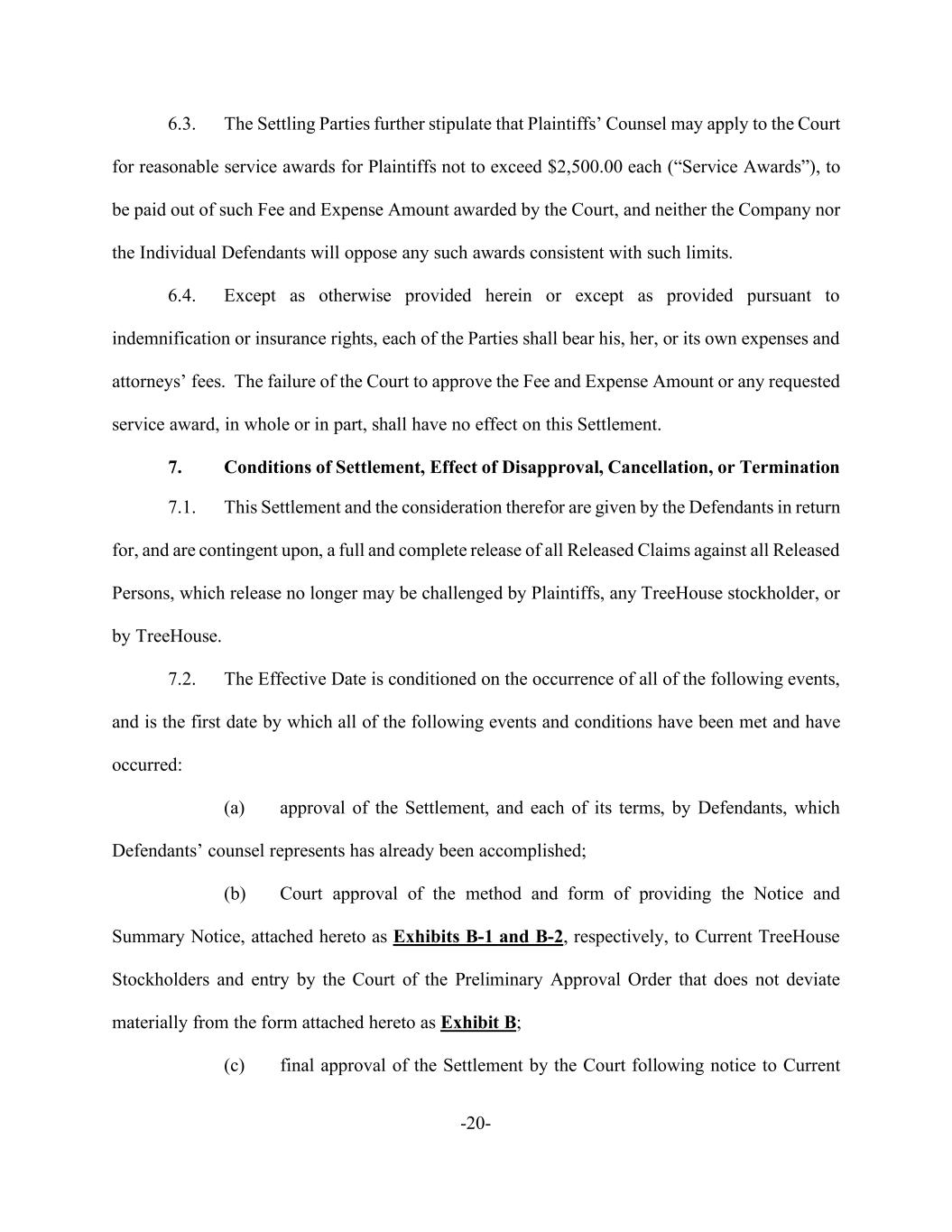 -20- 6.3. The Settling Parties further stipulate that Plaintiffs’ Counsel may apply to the Court for reasonable service awards for Plaintiffs not to exceed $2,500.00 each (“Service Awards”), to be paid out of such Fee and Expense Amount awarded by the Court, and neither the Company nor the Individual Defendants will oppose any such awards consistent with such limits. 6.4. Except as otherwise provided herein or except as provided pursuant to indemnification or insurance rights, each of the Parties shall bear his, her, or its own expenses and attorneys’ fees. The failure of the Court to approve the Fee and Expense Amount or any requested service award, in whole or in part, shall have no effect on this Settlement. 7. Conditions of Settlement, Effect of Disapproval, Cancellation, or Termination 7.1. This Settlement and the consideration therefor are given by the Defendants in return for, and are contingent upon, a full and complete release of all Released Claims against all Released Persons, which release no longer may be challenged by Plaintiffs, any TreeHouse stockholder, or by TreeHouse. 7.2. The Effective Date is conditioned on the occurrence of all of the following events, and is the first date by which all of the following events and conditions have been met and have occurred: (a) approval of the Settlement, and each of its terms, by Defendants, which Defendants’ counsel represents has already been accomplished; (b) Court approval of the method and form of providing the Notice and Summary Notice, attached hereto as Exhibits B-1 and B-2, respectively, to Current TreeHouse Stockholders and entry by the Court of the Preliminary Approval Order that does not deviate materially from the form attached hereto as Exhibit B; (c) final approval of the Settlement by the Court following notice to Current