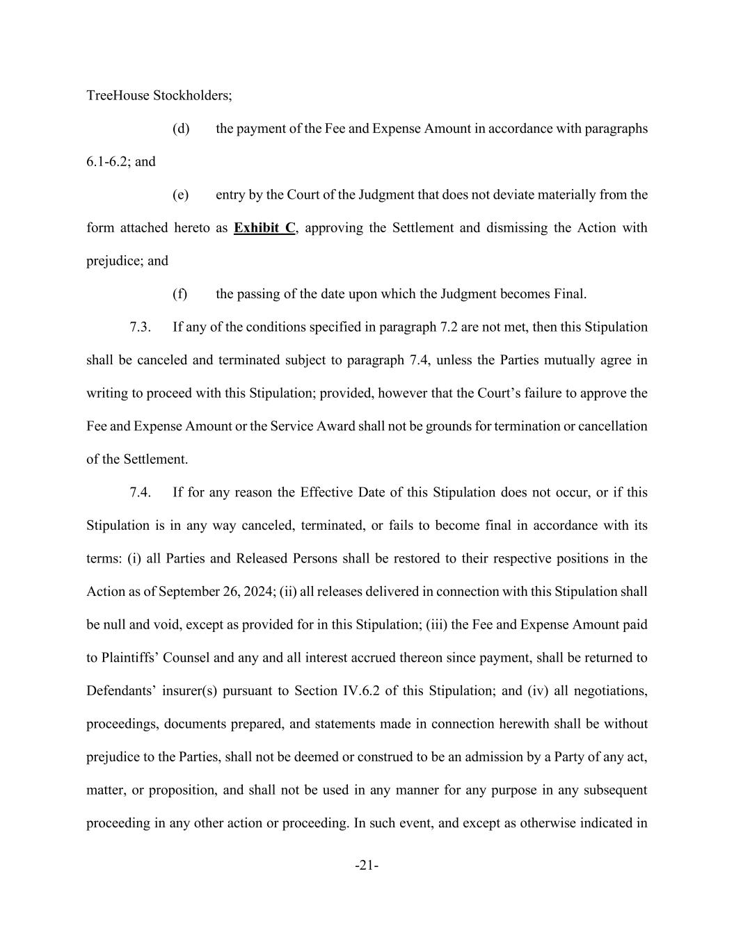 -21- TreeHouse Stockholders; (d) the payment of the Fee and Expense Amount in accordance with paragraphs 6.1-6.2; and (e) entry by the Court of the Judgment that does not deviate materially from the form attached hereto as Exhibit C, approving the Settlement and dismissing the Action with prejudice; and (f) the passing of the date upon which the Judgment becomes Final. 7.3. If any of the conditions specified in paragraph 7.2 are not met, then this Stipulation shall be canceled and terminated subject to paragraph 7.4, unless the Parties mutually agree in writing to proceed with this Stipulation; provided, however that the Court’s failure to approve the Fee and Expense Amount or the Service Award shall not be grounds for termination or cancellation of the Settlement. 7.4. If for any reason the Effective Date of this Stipulation does not occur, or if this Stipulation is in any way canceled, terminated, or fails to become final in accordance with its terms: (i) all Parties and Released Persons shall be restored to their respective positions in the Action as of September 26, 2024; (ii) all releases delivered in connection with this Stipulation shall be null and void, except as provided for in this Stipulation; (iii) the Fee and Expense Amount paid to Plaintiffs’ Counsel and any and all interest accrued thereon since payment, shall be returned to Defendants’ insurer(s) pursuant to Section IV.6.2 of this Stipulation; and (iv) all negotiations, proceedings, documents prepared, and statements made in connection herewith shall be without prejudice to the Parties, shall not be deemed or construed to be an admission by a Party of any act, matter, or proposition, and shall not be used in any manner for any purpose in any subsequent proceeding in any other action or proceeding. In such event, and except as otherwise indicated in