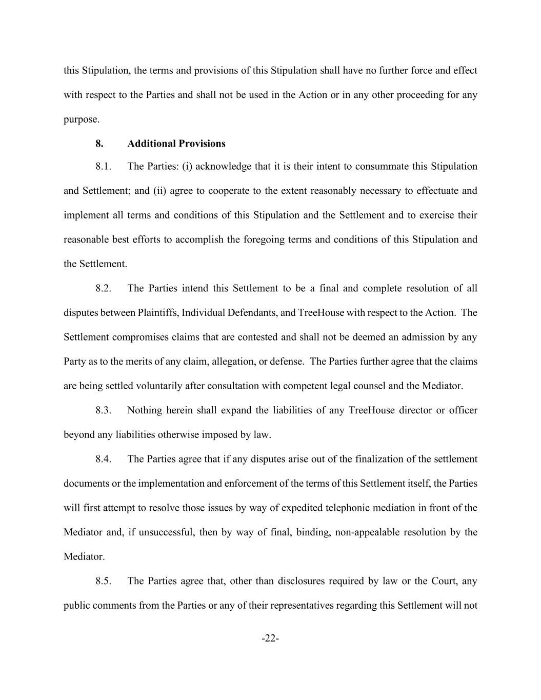 -22- this Stipulation, the terms and provisions of this Stipulation shall have no further force and effect with respect to the Parties and shall not be used in the Action or in any other proceeding for any purpose. 8. Additional Provisions 8.1. The Parties: (i) acknowledge that it is their intent to consummate this Stipulation and Settlement; and (ii) agree to cooperate to the extent reasonably necessary to effectuate and implement all terms and conditions of this Stipulation and the Settlement and to exercise their reasonable best efforts to accomplish the foregoing terms and conditions of this Stipulation and the Settlement. 8.2. The Parties intend this Settlement to be a final and complete resolution of all disputes between Plaintiffs, Individual Defendants, and TreeHouse with respect to the Action. The Settlement compromises claims that are contested and shall not be deemed an admission by any Party as to the merits of any claim, allegation, or defense. The Parties further agree that the claims are being settled voluntarily after consultation with competent legal counsel and the Mediator. 8.3. Nothing herein shall expand the liabilities of any TreeHouse director or officer beyond any liabilities otherwise imposed by law. 8.4. The Parties agree that if any disputes arise out of the finalization of the settlement documents or the implementation and enforcement of the terms of this Settlement itself, the Parties will first attempt to resolve those issues by way of expedited telephonic mediation in front of the Mediator and, if unsuccessful, then by way of final, binding, non-appealable resolution by the Mediator. 8.5. The Parties agree that, other than disclosures required by law or the Court, any public comments from the Parties or any of their representatives regarding this Settlement will not