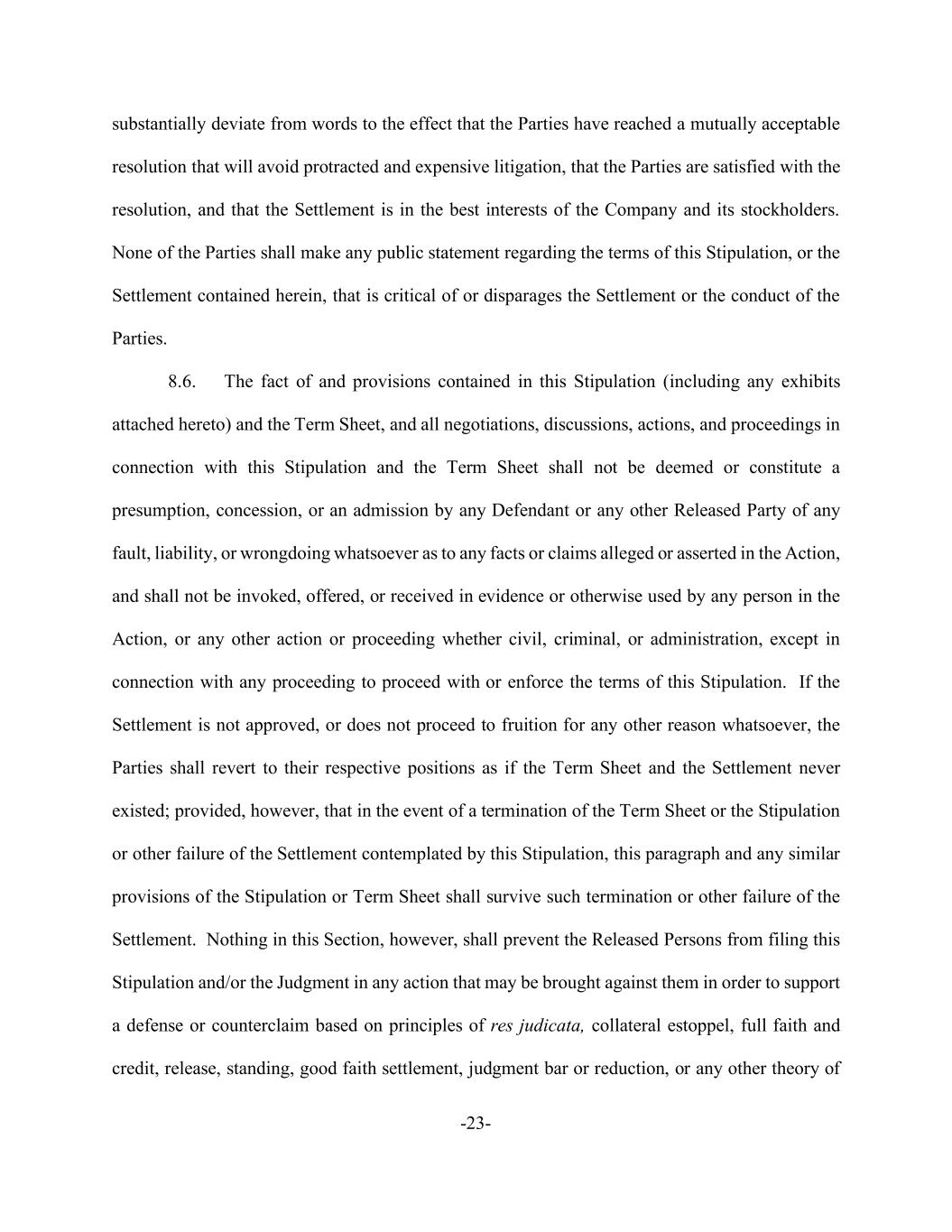 -23- substantially deviate from words to the effect that the Parties have reached a mutually acceptable resolution that will avoid protracted and expensive litigation, that the Parties are satisfied with the resolution, and that the Settlement is in the best interests of the Company and its stockholders. None of the Parties shall make any public statement regarding the terms of this Stipulation, or the Settlement contained herein, that is critical of or disparages the Settlement or the conduct of the Parties. 8.6. The fact of and provisions contained in this Stipulation (including any exhibits attached hereto) and the Term Sheet, and all negotiations, discussions, actions, and proceedings in connection with this Stipulation and the Term Sheet shall not be deemed or constitute a presumption, concession, or an admission by any Defendant or any other Released Party of any fault, liability, or wrongdoing whatsoever as to any facts or claims alleged or asserted in the Action, and shall not be invoked, offered, or received in evidence or otherwise used by any person in the Action, or any other action or proceeding whether civil, criminal, or administration, except in connection with any proceeding to proceed with or enforce the terms of this Stipulation. If the Settlement is not approved, or does not proceed to fruition for any other reason whatsoever, the Parties shall revert to their respective positions as if the Term Sheet and the Settlement never existed; provided, however, that in the event of a termination of the Term Sheet or the Stipulation or other failure of the Settlement contemplated by this Stipulation, this paragraph and any similar provisions of the Stipulation or Term Sheet shall survive such termination or other failure of the Settlement. Nothing in this Section, however, shall prevent the Released Persons from filing this Stipulation and/or the Judgment in any action that may be brought against them in order to support a defense or counterclaim based on principles of res judicata, collateral estoppel, full faith and credit, release, standing, good faith settlement, judgment bar or reduction, or any other theory of