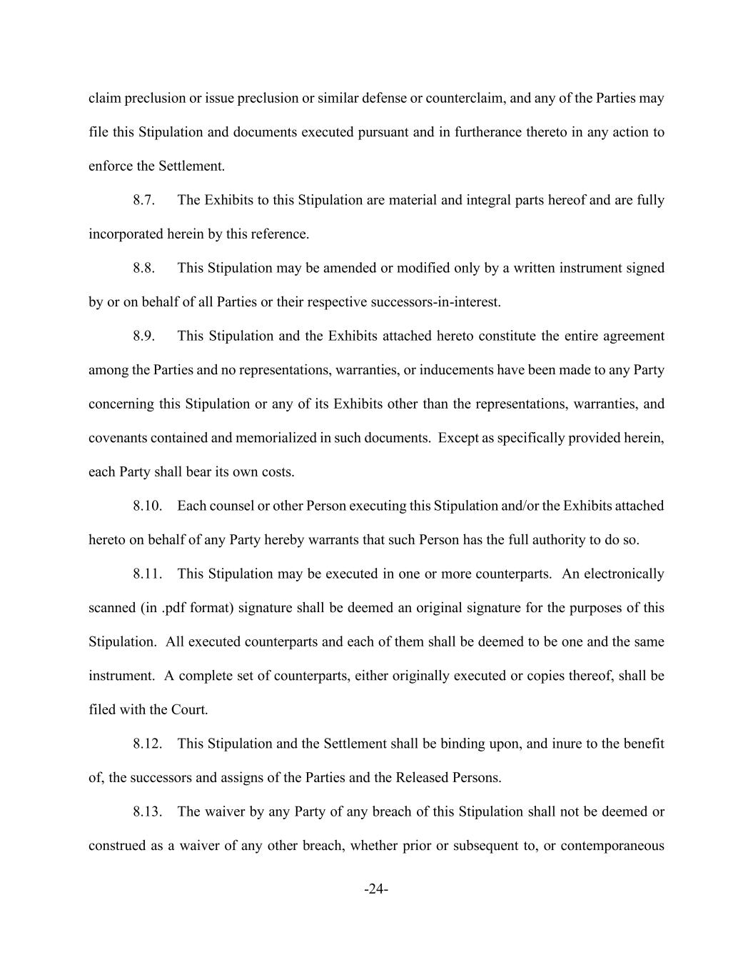-24- claim preclusion or issue preclusion or similar defense or counterclaim, and any of the Parties may file this Stipulation and documents executed pursuant and in furtherance thereto in any action to enforce the Settlement. 8.7. The Exhibits to this Stipulation are material and integral parts hereof and are fully incorporated herein by this reference. 8.8. This Stipulation may be amended or modified only by a written instrument signed by or on behalf of all Parties or their respective successors-in-interest. 8.9. This Stipulation and the Exhibits attached hereto constitute the entire agreement among the Parties and no representations, warranties, or inducements have been made to any Party concerning this Stipulation or any of its Exhibits other than the representations, warranties, and covenants contained and memorialized in such documents. Except as specifically provided herein, each Party shall bear its own costs. 8.10. Each counsel or other Person executing this Stipulation and/or the Exhibits attached hereto on behalf of any Party hereby warrants that such Person has the full authority to do so. 8.11. This Stipulation may be executed in one or more counterparts. An electronically scanned (in .pdf format) signature shall be deemed an original signature for the purposes of this Stipulation. All executed counterparts and each of them shall be deemed to be one and the same instrument. A complete set of counterparts, either originally executed or copies thereof, shall be filed with the Court. 8.12. This Stipulation and the Settlement shall be binding upon, and inure to the benefit of, the successors and assigns of the Parties and the Released Persons. 8.13. The waiver by any Party of any breach of this Stipulation shall not be deemed or construed as a waiver of any other breach, whether prior or subsequent to, or contemporaneous
