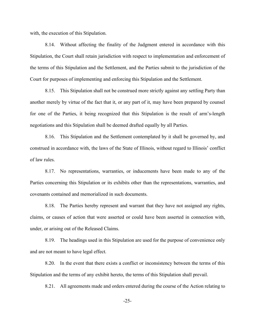 -25- with, the execution of this Stipulation. 8.14. Without affecting the finality of the Judgment entered in accordance with this Stipulation, the Court shall retain jurisdiction with respect to implementation and enforcement of the terms of this Stipulation and the Settlement, and the Parties submit to the jurisdiction of the Court for purposes of implementing and enforcing this Stipulation and the Settlement. 8.15. This Stipulation shall not be construed more strictly against any settling Party than another merely by virtue of the fact that it, or any part of it, may have been prepared by counsel for one of the Parties, it being recognized that this Stipulation is the result of arm’s-length negotiations and this Stipulation shall be deemed drafted equally by all Parties. 8.16. This Stipulation and the Settlement contemplated by it shall be governed by, and construed in accordance with, the laws of the State of Illinois, without regard to Illinois’ conflict of law rules. 8.17. No representations, warranties, or inducements have been made to any of the Parties concerning this Stipulation or its exhibits other than the representations, warranties, and covenants contained and memorialized in such documents. 8.18. The Parties hereby represent and warrant that they have not assigned any rights, claims, or causes of action that were asserted or could have been asserted in connection with, under, or arising out of the Released Claims. 8.19. The headings used in this Stipulation are used for the purpose of convenience only and are not meant to have legal effect. 8.20. In the event that there exists a conflict or inconsistency between the terms of this Stipulation and the terms of any exhibit hereto, the terms of this Stipulation shall prevail. 8.21. All agreements made and orders entered during the course of the Action relating to
