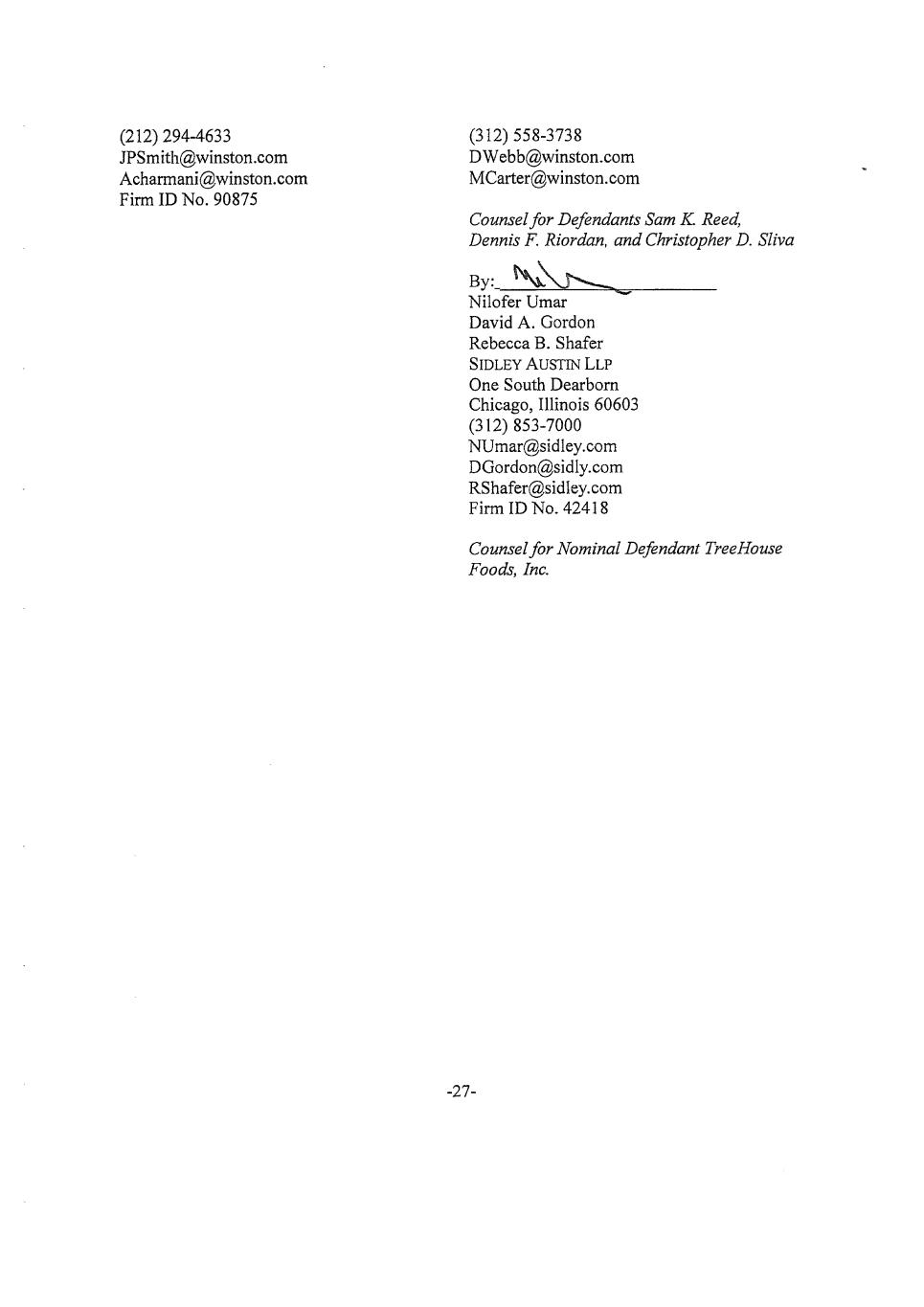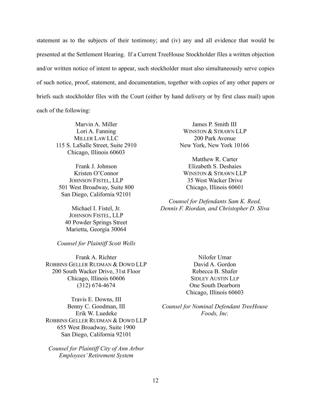 12 statement as to the subjects of their testimony; and (iv) any and all evidence that would be presented at the Settlement Hearing. If a Current TreeHouse Stockholder files a written objection and/or written notice of intent to appear, such stockholder must also simultaneously serve copies of such notice, proof, statement, and documentation, together with copies of any other papers or briefs such stockholder files with the Court (either by hand delivery or by first class mail) upon each of the following: Marvin A. Miller Lori A. Fanning MILLER LAW LLC 115 S. LaSalle Street, Suite 2910 Chicago, Illinois 60603 Frank J. Johnson Kristen O’Connor JOHNSON FISTEL, LLP 501 West Broadway, Suite 800 San Diego, California 92101 Michael I. Fistel, Jr. JOHNSON FISTEL, LLP 40 Powder Springs Street Marietta, Georgia 30064 Counsel for Plaintiff Scott Wells James P. Smith III WINSTON & STRAWN LLP 200 Park Avenue New York, New York 10166 Matthew R. Carter Elizabeth S. Deshaies WINSTON & STRAWN LLP 35 West Wacker Drive Chicago, Illinois 60601 Counsel for Defendants Sam K. Reed, Dennis F. Riordan, and Christopher D. Sliva Frank A. Richter ROBBINS GELLER RUDMAN & DOWD LLP 200 South Wacker Drive, 31st Floor Chicago, Illinois 60606 (312) 674-4674 Travis E. Downs, III Benny C. Goodman, III Erik W. Luedeke ROBBINS GELLER RUDMAN & DOWD LLP 655 West Broadway, Suite 1900 San Diego, California 92101 Counsel for Plaintiff City of Ann Arbor Employees’ Retirement System Nilofer Umar David A. Gordon Rebecca B. Shafer SIDLEY AUSTIN LLP One South Dearborn Chicago, Illinois 60603 Counsel for Nominal Defendant TreeHouse Foods, Inc.