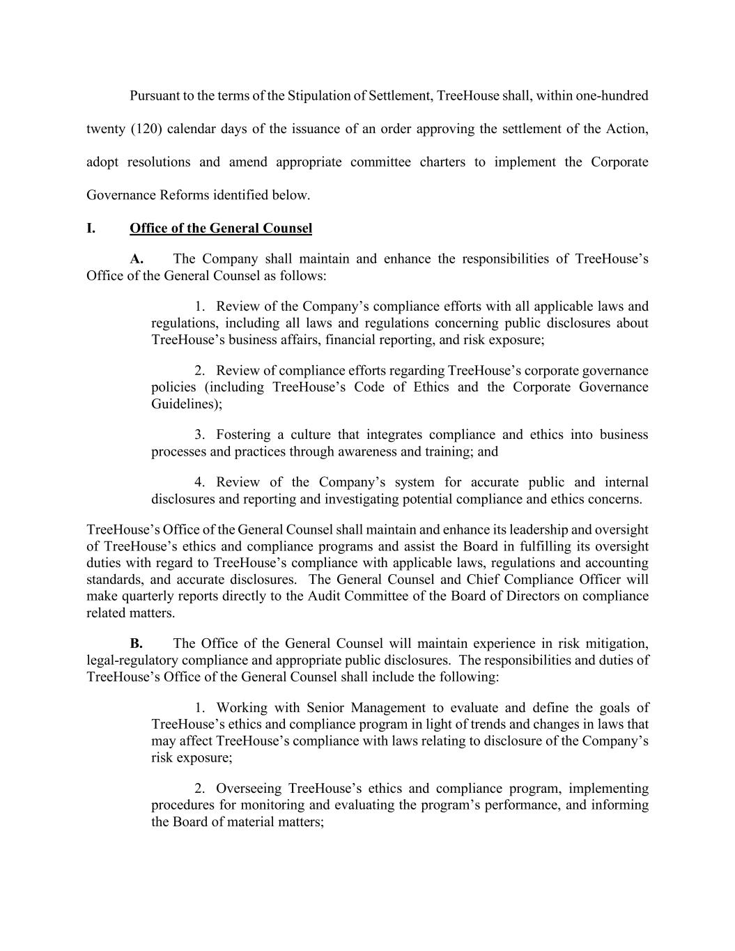 Pursuant to the terms of the Stipulation of Settlement, TreeHouse shall, within one-hundred twenty (120) calendar days of the issuance of an order approving the settlement of the Action, adopt resolutions and amend appropriate committee charters to implement the Corporate Governance Reforms identified below. I. Office of the General Counsel A. The Company shall maintain and enhance the responsibilities of TreeHouse’s Office of the General Counsel as follows: 1. Review of the Company’s compliance efforts with all applicable laws and regulations, including all laws and regulations concerning public disclosures about TreeHouse’s business affairs, financial reporting, and risk exposure; 2. Review of compliance efforts regarding TreeHouse’s corporate governance policies (including TreeHouse’s Code of Ethics and the Corporate Governance Guidelines); 3. Fostering a culture that integrates compliance and ethics into business processes and practices through awareness and training; and 4. Review of the Company’s system for accurate public and internal disclosures and reporting and investigating potential compliance and ethics concerns. TreeHouse’s Office of the General Counsel shall maintain and enhance its leadership and oversight of TreeHouse’s ethics and compliance programs and assist the Board in fulfilling its oversight duties with regard to TreeHouse’s compliance with applicable laws, regulations and accounting standards, and accurate disclosures. The General Counsel and Chief Compliance Officer will make quarterly reports directly to the Audit Committee of the Board of Directors on compliance related matters. B. The Office of the General Counsel will maintain experience in risk mitigation, legal-regulatory compliance and appropriate public disclosures. The responsibilities and duties of TreeHouse’s Office of the General Counsel shall include the following: 1. Working with Senior Management to evaluate and define the goals of TreeHouse’s ethics and compliance program in light of trends and changes in laws that may affect TreeHouse’s compliance with laws relating to disclosure of the Company’s risk exposure; 2. Overseeing TreeHouse’s ethics and compliance program, implementing procedures for monitoring and evaluating the program’s performance, and informing the Board of material matters;