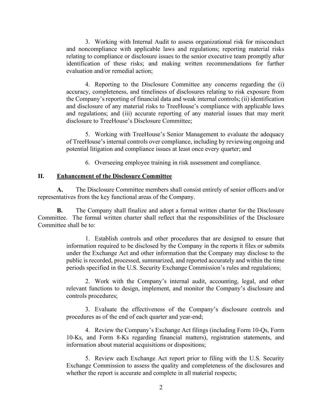 2 3. Working with Internal Audit to assess organizational risk for misconduct and noncompliance with applicable laws and regulations; reporting material risks relating to compliance or disclosure issues to the senior executive team promptly after identification of these risks; and making written recommendations for further evaluation and/or remedial action; 4. Reporting to the Disclosure Committee any concerns regarding the (i) accuracy, completeness, and timeliness of disclosures relating to risk exposure from the Company’s reporting of financial data and weak internal controls; (ii) identification and disclosure of any material risks to TreeHouse’s compliance with applicable laws and regulations; and (iii) accurate reporting of any material issues that may merit disclosure to TreeHouse’s Disclosure Committee; 5. Working with TreeHouse’s Senior Management to evaluate the adequacy of TreeHouse’s internal controls over compliance, including by reviewing ongoing and potential litigation and compliance issues at least once every quarter; and 6. Overseeing employee training in risk assessment and compliance. II. Enhancement of the Disclosure Committee A. The Disclosure Committee members shall consist entirely of senior officers and/or representatives from the key functional areas of the Company. B. The Company shall finalize and adopt a formal written charter for the Disclosure Committee. The formal written charter shall reflect that the responsibilities of the Disclosure Committee shall be to: 1. Establish controls and other procedures that are designed to ensure that information required to be disclosed by the Company in the reports it files or submits under the Exchange Act and other information that the Company may disclose to the public is recorded, processed, summarized, and reported accurately and within the time periods specified in the U.S. Security Exchange Commission’s rules and regulations; 2. Work with the Company’s internal audit, accounting, legal, and other relevant functions to design, implement, and monitor the Company’s disclosure and controls procedures; 3. Evaluate the effectiveness of the Company’s disclosure controls and procedures as of the end of each quarter and year-end; 4. Review the Company’s Exchange Act filings (including Form 10-Qs, Form 10-Ks, and Form 8-Ks regarding financial matters), registration statements, and information about material acquisitions or dispositions; 5. Review each Exchange Act report prior to filing with the U.S. Security Exchange Commission to assess the quality and completeness of the disclosures and whether the report is accurate and complete in all material respects;