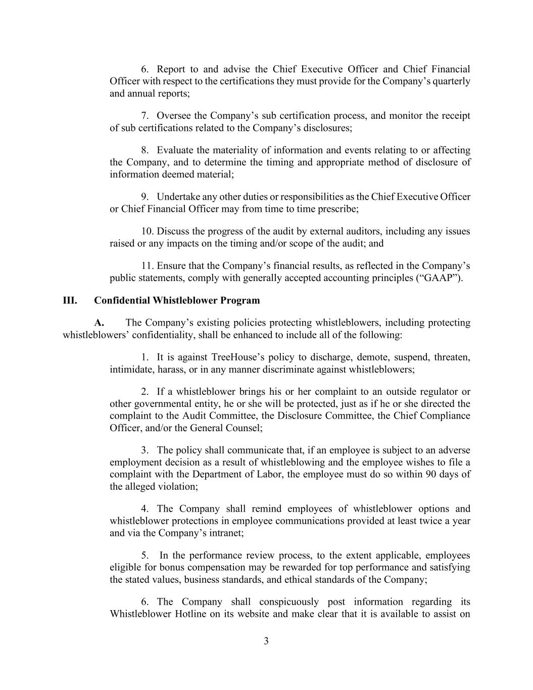 3 6. Report to and advise the Chief Executive Officer and Chief Financial Officer with respect to the certifications they must provide for the Company’s quarterly and annual reports; 7. Oversee the Company’s sub certification process, and monitor the receipt of sub certifications related to the Company’s disclosures; 8. Evaluate the materiality of information and events relating to or affecting the Company, and to determine the timing and appropriate method of disclosure of information deemed material; 9. Undertake any other duties or responsibilities as the Chief Executive Officer or Chief Financial Officer may from time to time prescribe; 10. Discuss the progress of the audit by external auditors, including any issues raised or any impacts on the timing and/or scope of the audit; and 11. Ensure that the Company’s financial results, as reflected in the Company’s public statements, comply with generally accepted accounting principles (“GAAP”). III. Confidential Whistleblower Program A. The Company’s existing policies protecting whistleblowers, including protecting whistleblowers’ confidentiality, shall be enhanced to include all of the following: 1. It is against TreeHouse’s policy to discharge, demote, suspend, threaten, intimidate, harass, or in any manner discriminate against whistleblowers; 2. If a whistleblower brings his or her complaint to an outside regulator or other governmental entity, he or she will be protected, just as if he or she directed the complaint to the Audit Committee, the Disclosure Committee, the Chief Compliance Officer, and/or the General Counsel; 3. The policy shall communicate that, if an employee is subject to an adverse employment decision as a result of whistleblowing and the employee wishes to file a complaint with the Department of Labor, the employee must do so within 90 days of the alleged violation; 4. The Company shall remind employees of whistleblower options and whistleblower protections in employee communications provided at least twice a year and via the Company’s intranet; 5. In the performance review process, to the extent applicable, employees eligible for bonus compensation may be rewarded for top performance and satisfying the stated values, business standards, and ethical standards of the Company; 6. The Company shall conspicuously post information regarding its Whistleblower Hotline on its website and make clear that it is available to assist on