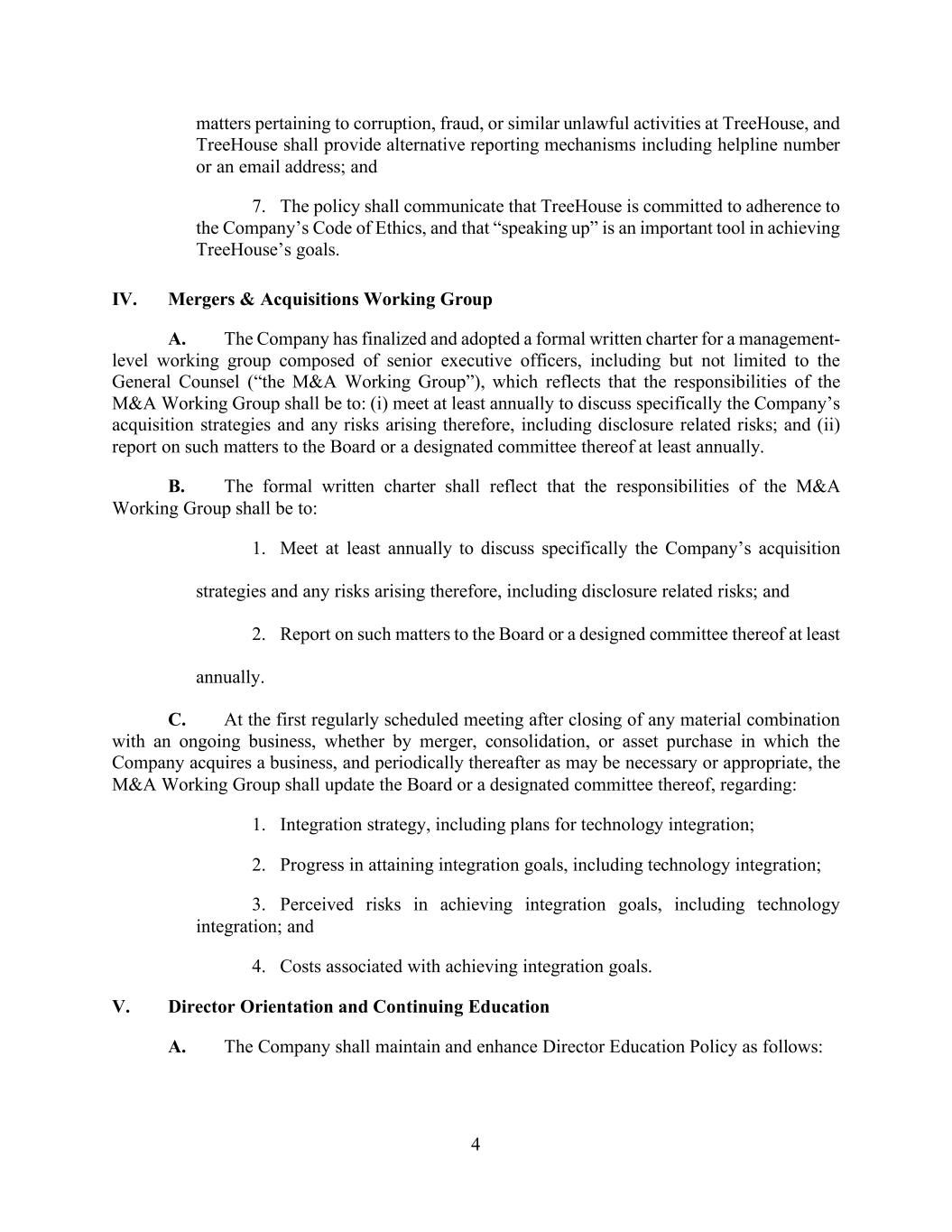 4 matters pertaining to corruption, fraud, or similar unlawful activities at TreeHouse, and TreeHouse shall provide alternative reporting mechanisms including helpline number or an email address; and 7. The policy shall communicate that TreeHouse is committed to adherence to the Company’s Code of Ethics, and that “speaking up” is an important tool in achieving TreeHouse’s goals. IV. Mergers & Acquisitions Working Group A. The Company has finalized and adopted a formal written charter for a management- level working group composed of senior executive officers, including but not limited to the General Counsel (“the M&A Working Group”), which reflects that the responsibilities of the M&A Working Group shall be to: (i) meet at least annually to discuss specifically the Company’s acquisition strategies and any risks arising therefore, including disclosure related risks; and (ii) report on such matters to the Board or a designated committee thereof at least annually. B. The formal written charter shall reflect that the responsibilities of the M&A Working Group shall be to: 1. Meet at least annually to discuss specifically the Company’s acquisition strategies and any risks arising therefore, including disclosure related risks; and 2. Report on such matters to the Board or a designed committee thereof at least annually. C. At the first regularly scheduled meeting after closing of any material combination with an ongoing business, whether by merger, consolidation, or asset purchase in which the Company acquires a business, and periodically thereafter as may be necessary or appropriate, the M&A Working Group shall update the Board or a designated committee thereof, regarding: 1. Integration strategy, including plans for technology integration; 2. Progress in attaining integration goals, including technology integration; 3. Perceived risks in achieving integration goals, including technology integration; and 4. Costs associated with achieving integration goals. V. Director Orientation and Continuing Education A. The Company shall maintain and enhance Director Education Policy as follows: