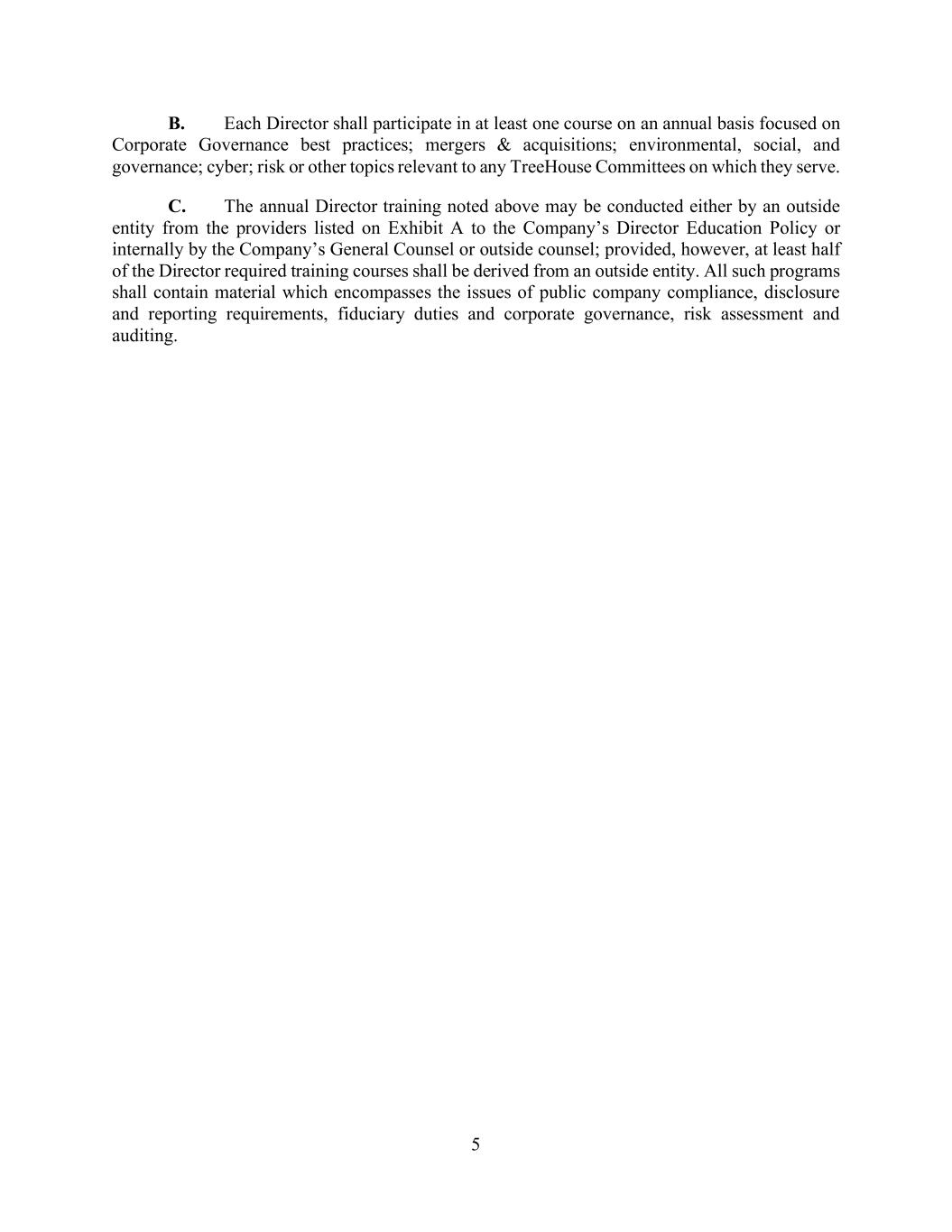 5 B. Each Director shall participate in at least one course on an annual basis focused on Corporate Governance best practices; mergers & acquisitions; environmental, social, and governance; cyber; risk or other topics relevant to any TreeHouse Committees on which they serve. C. The annual Director training noted above may be conducted either by an outside entity from the providers listed on Exhibit A to the Company’s Director Education Policy or internally by the Company’s General Counsel or outside counsel; provided, however, at least half of the Director required training courses shall be derived from an outside entity. All such programs shall contain material which encompasses the issues of public company compliance, disclosure and reporting requirements, fiduciary duties and corporate governance, risk assessment and auditing.