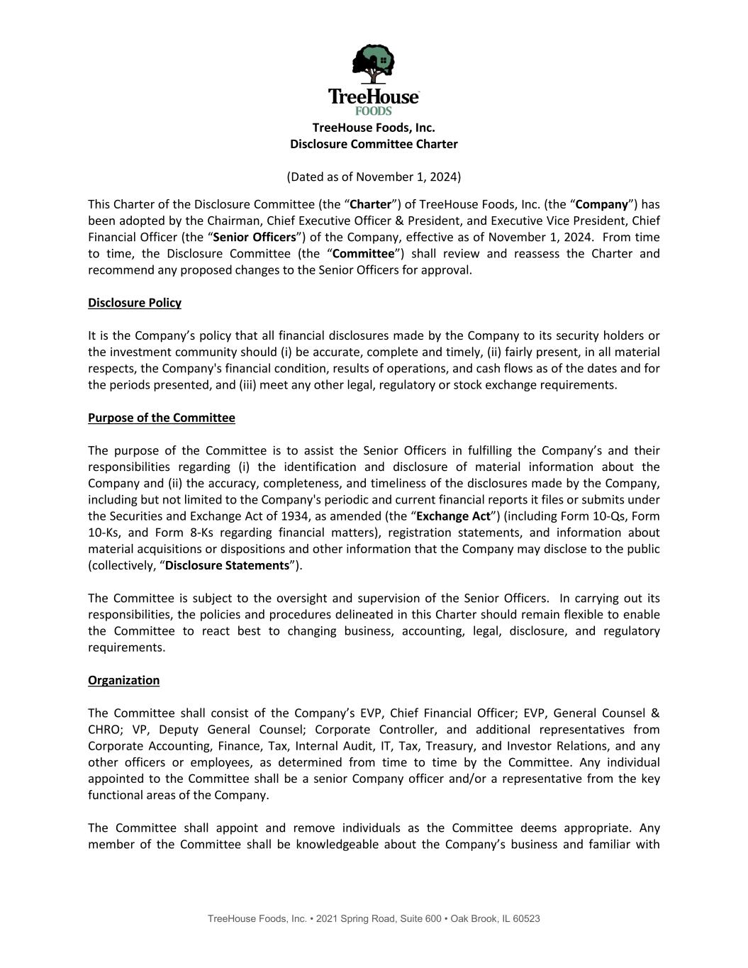 TreeHouse Foods, Inc. • 2021 Spring Road, Suite 600 • Oak Brook, IL 60523 TreeHouse Foods, Inc. Disclosure Committee Charter (Dated as of November 1, 2024) This Charter of the Disclosure Committee (the “Charter”) of TreeHouse Foods, Inc. (the “Company”) has been adopted by the Chairman, Chief Executive Officer & President, and Executive Vice President, Chief Financial Officer (the “Senior Officers”) of the Company, effective as of November 1, 2024. From time to time, the Disclosure Committee (the “Committee”) shall review and reassess the Charter and recommend any proposed changes to the Senior Officers for approval. Disclosure Policy It is the Company’s policy that all financial disclosures made by the Company to its security holders or the investment community should (i) be accurate, complete and timely, (ii) fairly present, in all material respects, the Company's financial condition, results of operations, and cash flows as of the dates and for the periods presented, and (iii) meet any other legal, regulatory or stock exchange requirements. Purpose of the Committee The purpose of the Committee is to assist the Senior Officers in fulfilling the Company’s and their responsibilities regarding (i) the identification and disclosure of material information about the Company and (ii) the accuracy, completeness, and timeliness of the disclosures made by the Company, including but not limited to the Company's periodic and current financial reports it files or submits under the Securities and Exchange Act of 1934, as amended (the “Exchange Act”) (including Form 10-Qs, Form 10-Ks, and Form 8-Ks regarding financial matters), registration statements, and information about material acquisitions or dispositions and other information that the Company may disclose to the public (collectively, “Disclosure Statements”). The Committee is subject to the oversight and supervision of the Senior Officers. In carrying out its responsibilities, the policies and procedures delineated in this Charter should remain flexible to enable the Committee to react best to changing business, accounting, legal, disclosure, and regulatory requirements. Organization The Committee shall consist of the Company’s EVP, Chief Financial Officer; EVP, General Counsel & CHRO; VP, Deputy General Counsel; Corporate Controller, and additional representatives from Corporate Accounting, Finance, Tax, Internal Audit, IT, Tax, Treasury, and Investor Relations, and any other officers or employees, as determined from time to time by the Committee. Any individual appointed to the Committee shall be a senior Company officer and/or a representative from the key functional areas of the Company. The Committee shall appoint and remove individuals as the Committee deems appropriate. Any member of the Committee shall be knowledgeable about the Company’s business and familiar with