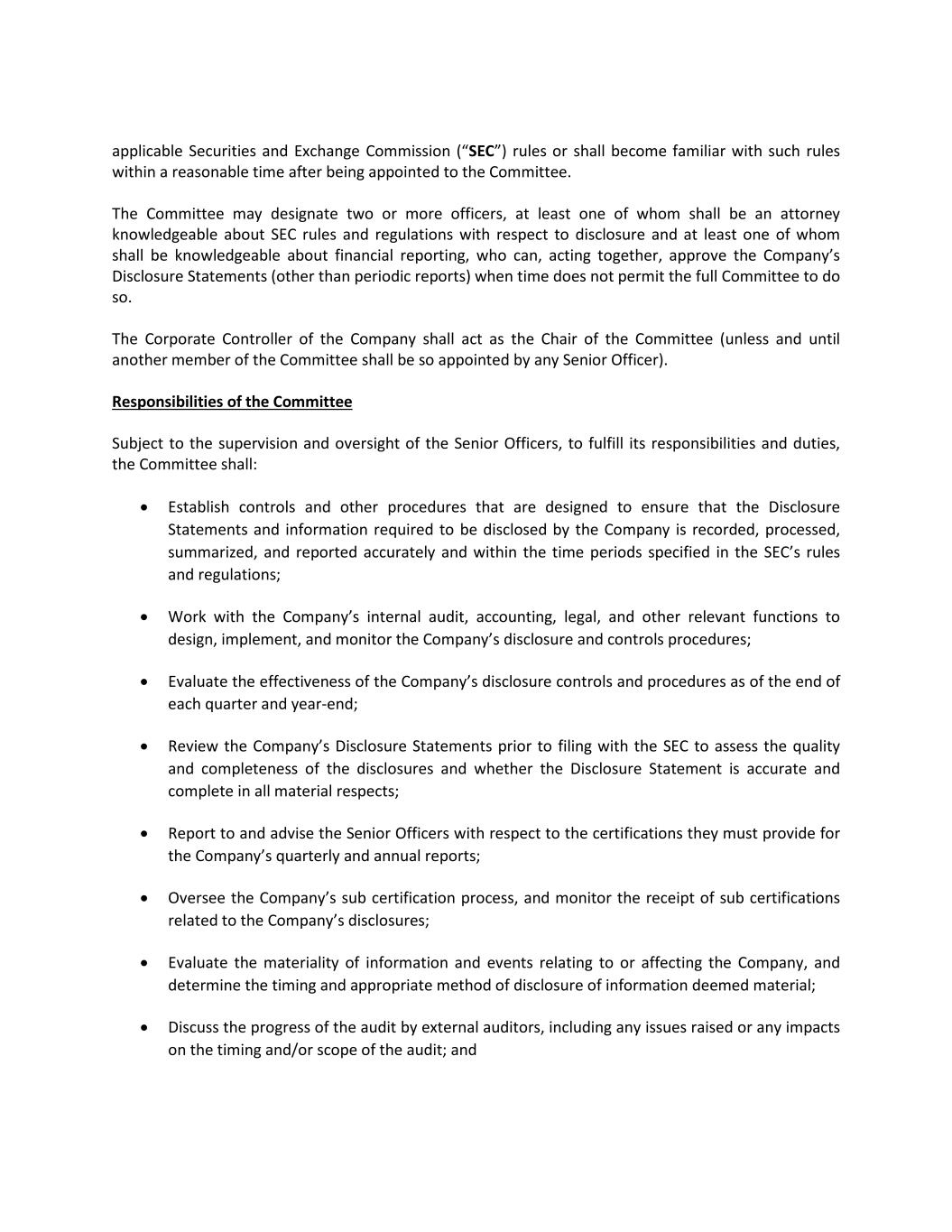 applicable Securities and Exchange Commission (“SEC”) rules or shall become familiar with such rules within a reasonable time after being appointed to the Committee. The Committee may designate two or more officers, at least one of whom shall be an attorney knowledgeable about SEC rules and regulations with respect to disclosure and at least one of whom shall be knowledgeable about financial reporting, who can, acting together, approve the Company’s Disclosure Statements (other than periodic reports) when time does not permit the full Committee to do so. The Corporate Controller of the Company shall act as the Chair of the Committee (unless and until another member of the Committee shall be so appointed by any Senior Officer). Responsibilities of the Committee Subject to the supervision and oversight of the Senior Officers, to fulfill its responsibilities and duties, the Committee shall: • Establish controls and other procedures that are designed to ensure that the Disclosure Statements and information required to be disclosed by the Company is recorded, processed, summarized, and reported accurately and within the time periods specified in the SEC’s rules and regulations; • Work with the Company’s internal audit, accounting, legal, and other relevant functions to design, implement, and monitor the Company’s disclosure and controls procedures; • Evaluate the effectiveness of the Company’s disclosure controls and procedures as of the end of each quarter and year-end; • Review the Company’s Disclosure Statements prior to filing with the SEC to assess the quality and completeness of the disclosures and whether the Disclosure Statement is accurate and complete in all material respects; • Report to and advise the Senior Officers with respect to the certifications they must provide for the Company’s quarterly and annual reports; • Oversee the Company’s sub certification process, and monitor the receipt of sub certifications related to the Company’s disclosures; • Evaluate the materiality of information and events relating to or affecting the Company, and determine the timing and appropriate method of disclosure of information deemed material; • Discuss the progress of the audit by external auditors, including any issues raised or any impacts on the timing and/or scope of the audit; and
