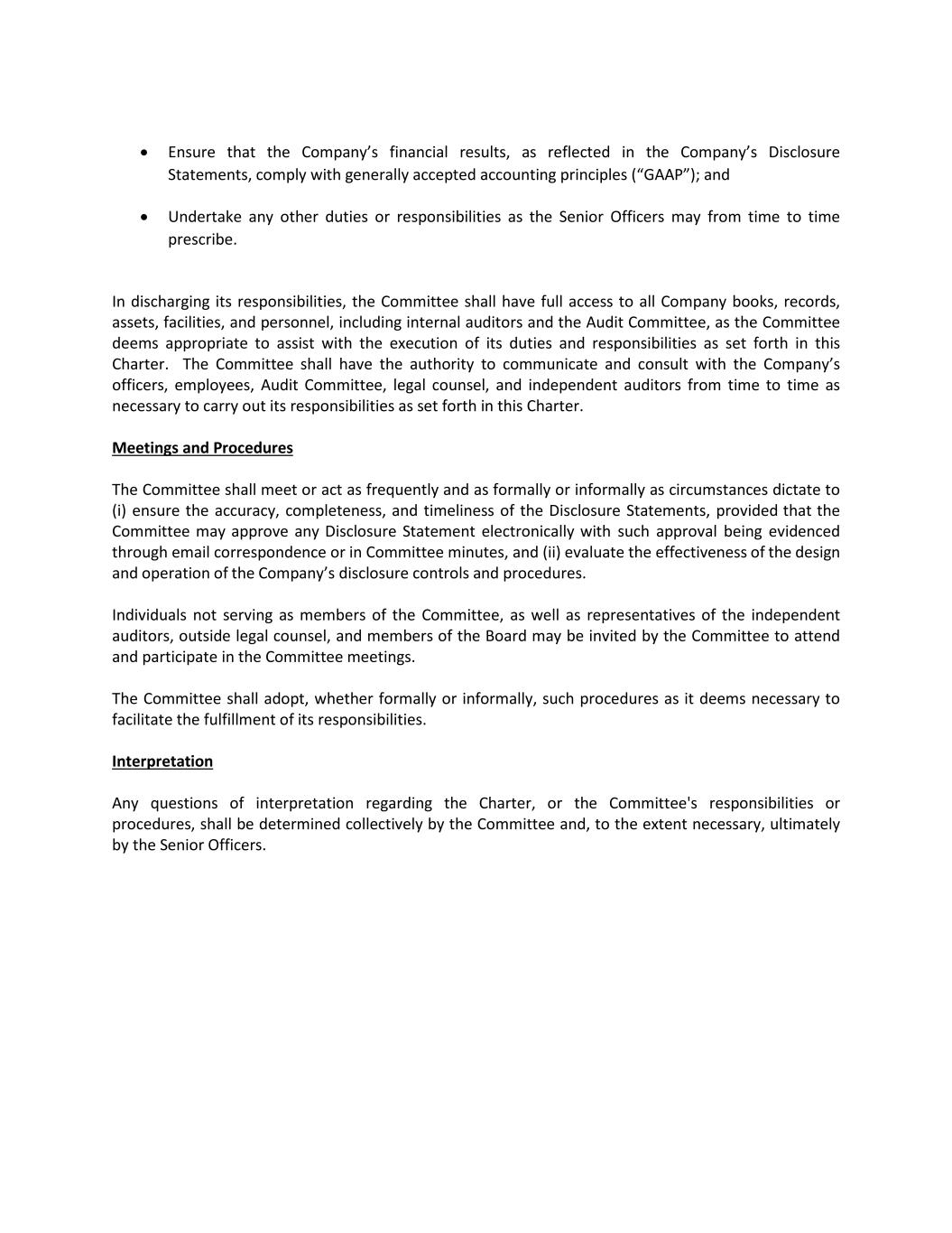 • Ensure that the Company’s financial results, as reflected in the Company’s Disclosure Statements, comply with generally accepted accounting principles (“GAAP”); and • Undertake any other duties or responsibilities as the Senior Officers may from time to time prescribe. In discharging its responsibilities, the Committee shall have full access to all Company books, records, assets, facilities, and personnel, including internal auditors and the Audit Committee, as the Committee deems appropriate to assist with the execution of its duties and responsibilities as set forth in this Charter. The Committee shall have the authority to communicate and consult with the Company’s officers, employees, Audit Committee, legal counsel, and independent auditors from time to time as necessary to carry out its responsibilities as set forth in this Charter. Meetings and Procedures The Committee shall meet or act as frequently and as formally or informally as circumstances dictate to (i) ensure the accuracy, completeness, and timeliness of the Disclosure Statements, provided that the Committee may approve any Disclosure Statement electronically with such approval being evidenced through email correspondence or in Committee minutes, and (ii) evaluate the effectiveness of the design and operation of the Company’s disclosure controls and procedures. Individuals not serving as members of the Committee, as well as representatives of the independent auditors, outside legal counsel, and members of the Board may be invited by the Committee to attend and participate in the Committee meetings. The Committee shall adopt, whether formally or informally, such procedures as it deems necessary to facilitate the fulfillment of its responsibilities. Interpretation Any questions of interpretation regarding the Charter, or the Committee's responsibilities or procedures, shall be determined collectively by the Committee and, to the extent necessary, ultimately by the Senior Officers.