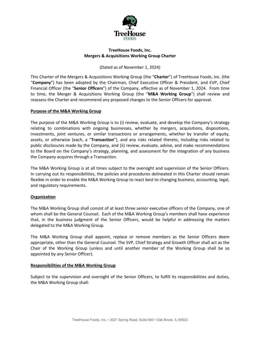 TreeHouse Foods, Inc. • 2021 Spring Road, Suite 600 • Oak Brook, IL 60523 TreeHouse Foods, Inc. Mergers & Acquisitions Working Group Charter (Dated as of November 1, 2024) This Charter of the Mergers & Acquisitions Working Group (the “Charter”) of TreeHouse Foods, Inc. (the “Company”) has been adopted by the Chairman, Chief Executive Officer & President, and EVP, Chief Financial Officer (the “Senior Officers”) of the Company, effective as of November 1, 2024. From time to time, the Merger & Acquisitions Working Group (the “M&A Working Group”) shall review and reassess the Charter and recommend any proposed changes to the Senior Officers for approval. Purpose of the M&A Working Group The purpose of the M&A Working Group is to (i) review, evaluate, and develop the Company’s strategy relating to combinations with ongoing businesses, whether by mergers, acquisitions, dispositions, investments, joint ventures, or similar transactions or arrangements, whether by transfer of equity, assets, or otherwise (each, a “Transaction”), and any risks related thereto, including risks related to public disclosures made by the Company, and (ii) review, evaluate, advise, and make recommendations to the Board on the Company’s strategy, planning, and assessment for the integration of any business the Company acquires through a Transaction. The M&A Working Group is at all times subject to the oversight and supervision of the Senior Officers. In carrying out its responsibilities, the policies and procedures delineated in this Charter should remain flexible in order to enable the M&A Working Group to react best to changing business, accounting, legal, and regulatory requirements. Organization The M&A Working Group shall consist of at least three senior executive officers of the Company, one of whom shall be the General Counsel. Each of the M&A Working Group’s members shall have experience that, in the business judgment of the Senior Officers, would be helpful in addressing the matters delegated to the M&A Working Group. The M&A Working Group shall appoint, replace or remove members as the Senior Officers deem appropriate, other than the General Counsel. The SVP, Chief Strategy and Growth Officer shall act as the Chair of the Working Group (unless and until another member of the Working Group shall be so appointed by any Senior Officer). Responsibilities of the M&A Working Group Subject to the supervision and oversight of the Senior Officers, to fulfill its responsibilities and duties, the M&A Working Group shall: