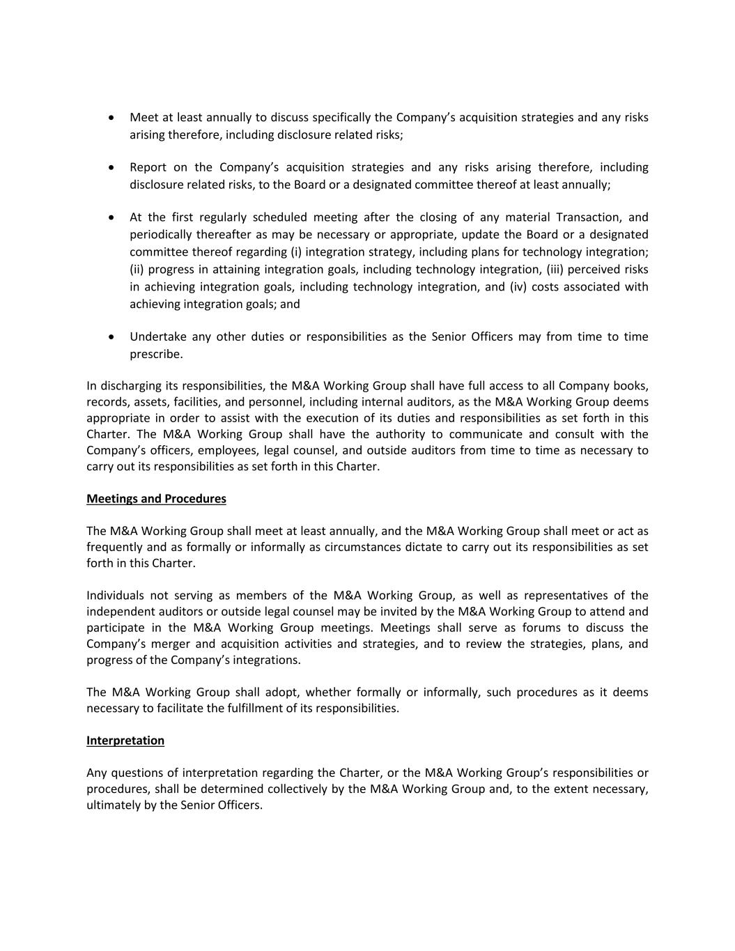 • Meet at least annually to discuss specifically the Company’s acquisition strategies and any risks arising therefore, including disclosure related risks; • Report on the Company’s acquisition strategies and any risks arising therefore, including disclosure related risks, to the Board or a designated committee thereof at least annually; • At the first regularly scheduled meeting after the closing of any material Transaction, and periodically thereafter as may be necessary or appropriate, update the Board or a designated committee thereof regarding (i) integration strategy, including plans for technology integration; (ii) progress in attaining integration goals, including technology integration, (iii) perceived risks in achieving integration goals, including technology integration, and (iv) costs associated with achieving integration goals; and • Undertake any other duties or responsibilities as the Senior Officers may from time to time prescribe. In discharging its responsibilities, the M&A Working Group shall have full access to all Company books, records, assets, facilities, and personnel, including internal auditors, as the M&A Working Group deems appropriate in order to assist with the execution of its duties and responsibilities as set forth in this Charter. The M&A Working Group shall have the authority to communicate and consult with the Company’s officers, employees, legal counsel, and outside auditors from time to time as necessary to carry out its responsibilities as set forth in this Charter. Meetings and Procedures The M&A Working Group shall meet at least annually, and the M&A Working Group shall meet or act as frequently and as formally or informally as circumstances dictate to carry out its responsibilities as set forth in this Charter. Individuals not serving as members of the M&A Working Group, as well as representatives of the independent auditors or outside legal counsel may be invited by the M&A Working Group to attend and participate in the M&A Working Group meetings. Meetings shall serve as forums to discuss the Company’s merger and acquisition activities and strategies, and to review the strategies, plans, and progress of the Company’s integrations. The M&A Working Group shall adopt, whether formally or informally, such procedures as it deems necessary to facilitate the fulfillment of its responsibilities. Interpretation Any questions of interpretation regarding the Charter, or the M&A Working Group’s responsibilities or procedures, shall be determined collectively by the M&A Working Group and, to the extent necessary, ultimately by the Senior Officers.