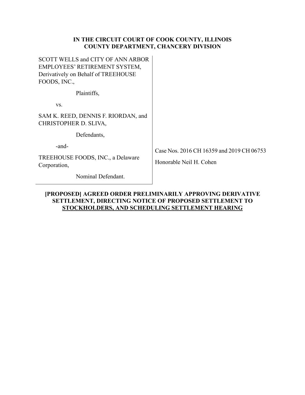 IN THE CIRCUIT COURT OF COOK COUNTY, ILLINOIS COUNTY DEPARTMENT, CHANCERY DIVISION SCOTT WELLS and CITY OF ANN ARBOR EMPLOYEES’ RETIREMENT SYSTEM, Derivatively on Behalf of TREEHOUSE FOODS, INC., Plaintiffs, vs. SAM K. REED, DENNIS F. RIORDAN, and CHRISTOPHER D. SLIVA, Defendants, -and- TREEHOUSE FOODS, INC., a Delaware Corporation, Nominal Defendant. Case Nos. 2016 CH 16359 and 2019 CH 06753 Honorable Neil H. Cohen [PROPOSED] AGREED ORDER PRELIMINARILY APPROVING DERIVATIVE SETTLEMENT, DIRECTING NOTICE OF PROPOSED SETTLEMENT TO STOCKHOLDERS, AND SCHEDULING SETTLEMENT HEARING