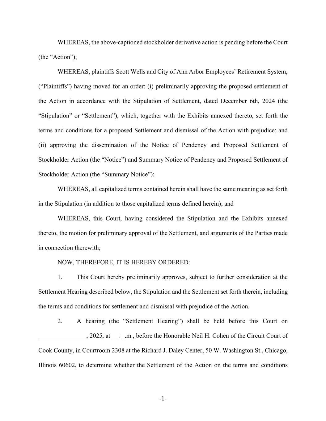 -1- WHEREAS, the above-captioned stockholder derivative action is pending before the Court (the “Action”); WHEREAS, plaintiffs Scott Wells and City of Ann Arbor Employees’ Retirement System, (“Plaintiffs”) having moved for an order: (i) preliminarily approving the proposed settlement of the Action in accordance with the Stipulation of Settlement, dated December 6th, 2024 (the “Stipulation” or “Settlement”), which, together with the Exhibits annexed thereto, set forth the terms and conditions for a proposed Settlement and dismissal of the Action with prejudice; and (ii) approving the dissemination of the Notice of Pendency and Proposed Settlement of Stockholder Action (the “Notice”) and Summary Notice of Pendency and Proposed Settlement of Stockholder Action (the “Summary Notice”); WHEREAS, all capitalized terms contained herein shall have the same meaning as set forth in the Stipulation (in addition to those capitalized terms defined herein); and WHEREAS, this Court, having considered the Stipulation and the Exhibits annexed thereto, the motion for preliminary approval of the Settlement, and arguments of the Parties made in connection therewith; NOW, THEREFORE, IT IS HEREBY ORDERED: 1. This Court hereby preliminarily approves, subject to further consideration at the Settlement Hearing described below, the Stipulation and the Settlement set forth therein, including the terms and conditions for settlement and dismissal with prejudice of the Action. 2. A hearing (the “Settlement Hearing”) shall be held before this Court on _______________, 2025, at __: _.m., before the Honorable Neil H. Cohen of the Circuit Court of Cook County, in Courtroom 2308 at the Richard J. Daley Center, 50 W. Washington St., Chicago, Illinois 60602, to determine whether the Settlement of the Action on the terms and conditions