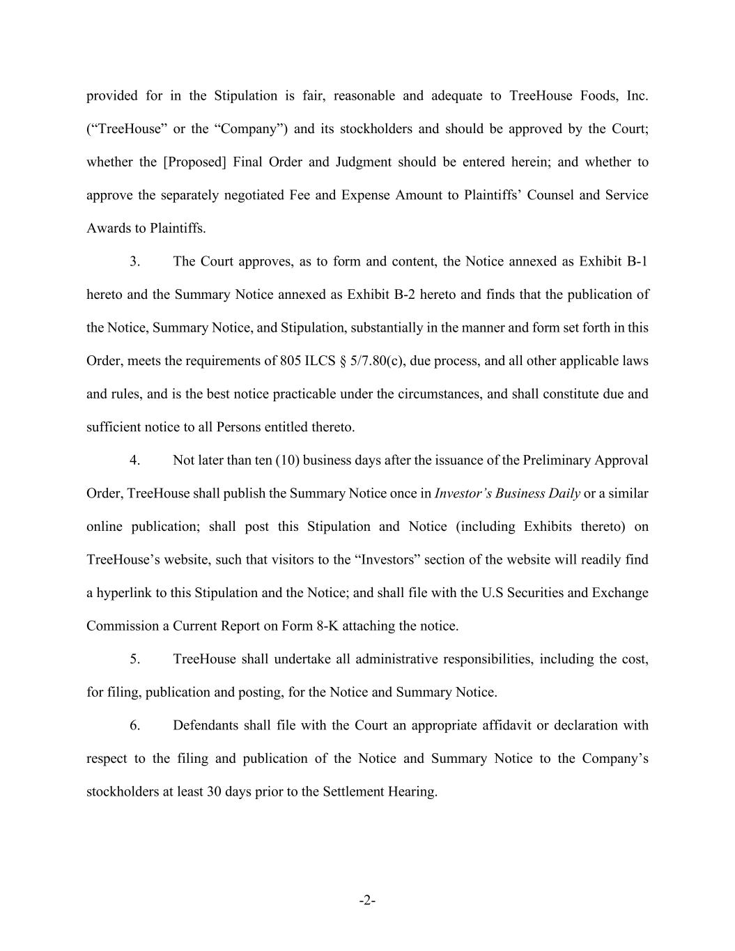 -2- provided for in the Stipulation is fair, reasonable and adequate to TreeHouse Foods, Inc. (“TreeHouse” or the “Company”) and its stockholders and should be approved by the Court; whether the [Proposed] Final Order and Judgment should be entered herein; and whether to approve the separately negotiated Fee and Expense Amount to Plaintiffs’ Counsel and Service Awards to Plaintiffs. 3. The Court approves, as to form and content, the Notice annexed as Exhibit B-1 hereto and the Summary Notice annexed as Exhibit B-2 hereto and finds that the publication of the Notice, Summary Notice, and Stipulation, substantially in the manner and form set forth in this Order, meets the requirements of 805 ILCS § 5/7.80(c), due process, and all other applicable laws and rules, and is the best notice practicable under the circumstances, and shall constitute due and sufficient notice to all Persons entitled thereto. 4. Not later than ten (10) business days after the issuance of the Preliminary Approval Order, TreeHouse shall publish the Summary Notice once in Investor’s Business Daily or a similar online publication; shall post this Stipulation and Notice (including Exhibits thereto) on TreeHouse’s website, such that visitors to the “Investors” section of the website will readily find a hyperlink to this Stipulation and the Notice; and shall file with the U.S Securities and Exchange Commission a Current Report on Form 8-K attaching the notice. 5. TreeHouse shall undertake all administrative responsibilities, including the cost, for filing, publication and posting, for the Notice and Summary Notice. 6. Defendants shall file with the Court an appropriate affidavit or declaration with respect to the filing and publication of the Notice and Summary Notice to the Company’s stockholders at least 30 days prior to the Settlement Hearing.