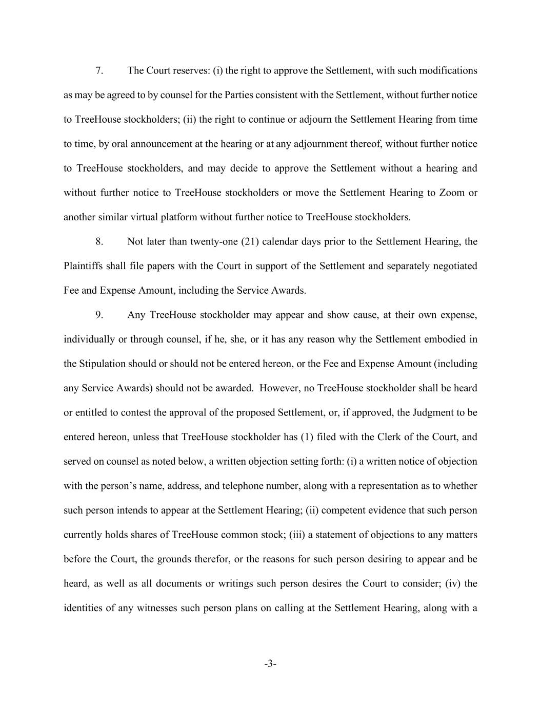 -3- 7. The Court reserves: (i) the right to approve the Settlement, with such modifications as may be agreed to by counsel for the Parties consistent with the Settlement, without further notice to TreeHouse stockholders; (ii) the right to continue or adjourn the Settlement Hearing from time to time, by oral announcement at the hearing or at any adjournment thereof, without further notice to TreeHouse stockholders, and may decide to approve the Settlement without a hearing and without further notice to TreeHouse stockholders or move the Settlement Hearing to Zoom or another similar virtual platform without further notice to TreeHouse stockholders. 8. Not later than twenty-one (21) calendar days prior to the Settlement Hearing, the Plaintiffs shall file papers with the Court in support of the Settlement and separately negotiated Fee and Expense Amount, including the Service Awards. 9. Any TreeHouse stockholder may appear and show cause, at their own expense, individually or through counsel, if he, she, or it has any reason why the Settlement embodied in the Stipulation should or should not be entered hereon, or the Fee and Expense Amount (including any Service Awards) should not be awarded. However, no TreeHouse stockholder shall be heard or entitled to contest the approval of the proposed Settlement, or, if approved, the Judgment to be entered hereon, unless that TreeHouse stockholder has (1) filed with the Clerk of the Court, and served on counsel as noted below, a written objection setting forth: (i) a written notice of objection with the person’s name, address, and telephone number, along with a representation as to whether such person intends to appear at the Settlement Hearing; (ii) competent evidence that such person currently holds shares of TreeHouse common stock; (iii) a statement of objections to any matters before the Court, the grounds therefor, or the reasons for such person desiring to appear and be heard, as well as all documents or writings such person desires the Court to consider; (iv) the identities of any witnesses such person plans on calling at the Settlement Hearing, along with a