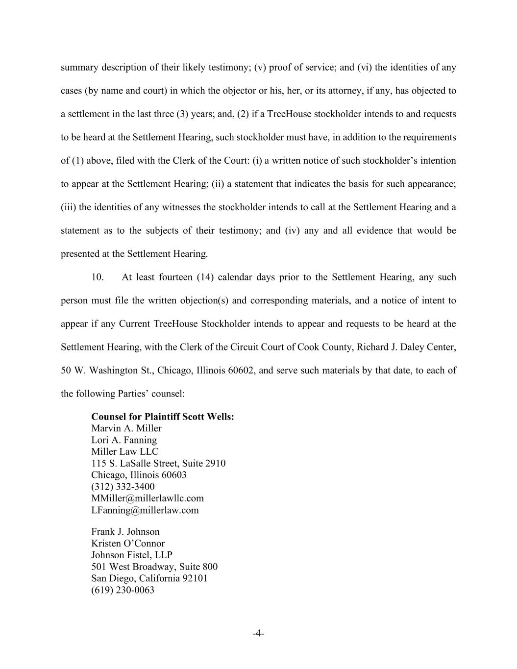 -4- summary description of their likely testimony; (v) proof of service; and (vi) the identities of any cases (by name and court) in which the objector or his, her, or its attorney, if any, has objected to a settlement in the last three (3) years; and, (2) if a TreeHouse stockholder intends to and requests to be heard at the Settlement Hearing, such stockholder must have, in addition to the requirements of (1) above, filed with the Clerk of the Court: (i) a written notice of such stockholder’s intention to appear at the Settlement Hearing; (ii) a statement that indicates the basis for such appearance; (iii) the identities of any witnesses the stockholder intends to call at the Settlement Hearing and a statement as to the subjects of their testimony; and (iv) any and all evidence that would be presented at the Settlement Hearing. 10. At least fourteen (14) calendar days prior to the Settlement Hearing, any such person must file the written objection(s) and corresponding materials, and a notice of intent to appear if any Current TreeHouse Stockholder intends to appear and requests to be heard at the Settlement Hearing, with the Clerk of the Circuit Court of Cook County, Richard J. Daley Center, 50 W. Washington St., Chicago, Illinois 60602, and serve such materials by that date, to each of the following Parties’ counsel: Counsel for Plaintiff Scott Wells: Marvin A. Miller Lori A. Fanning Miller Law LLC 115 S. LaSalle Street, Suite 2910 Chicago, Illinois 60603 (312) 332-3400 MMiller@millerlawllc.com LFanning@millerlaw.com Frank J. Johnson Kristen O’Connor Johnson Fistel, LLP 501 West Broadway, Suite 800 San Diego, California 92101 (619) 230-0063