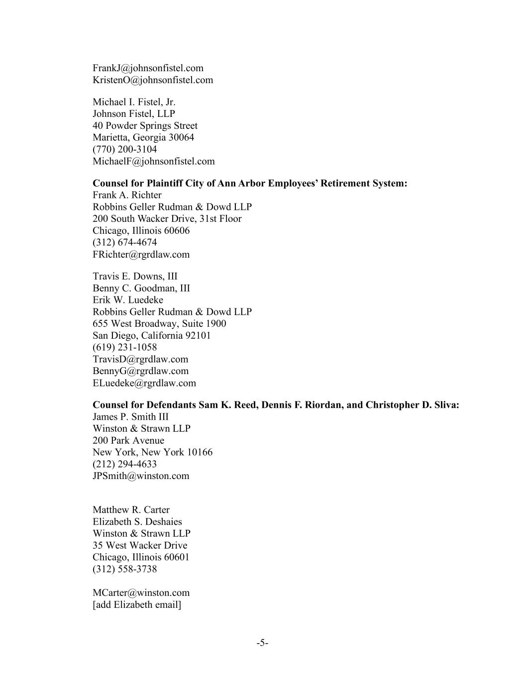 -5- FrankJ@johnsonfistel.com KristenO@johnsonfistel.com Michael I. Fistel, Jr. Johnson Fistel, LLP 40 Powder Springs Street Marietta, Georgia 30064 (770) 200-3104 MichaelF@johnsonfistel.com Counsel for Plaintiff City of Ann Arbor Employees’ Retirement System: Frank A. Richter Robbins Geller Rudman & Dowd LLP 200 South Wacker Drive, 31st Floor Chicago, Illinois 60606 (312) 674-4674 FRichter@rgrdlaw.com Travis E. Downs, III Benny C. Goodman, III Erik W. Luedeke Robbins Geller Rudman & Dowd LLP 655 West Broadway, Suite 1900 San Diego, California 92101 (619) 231-1058 TravisD@rgrdlaw.com BennyG@rgrdlaw.com ELuedeke@rgrdlaw.com Counsel for Defendants Sam K. Reed, Dennis F. Riordan, and Christopher D. Sliva: James P. Smith III Winston & Strawn LLP 200 Park Avenue New York, New York 10166 (212) 294-4633 JPSmith@winston.com Matthew R. Carter Elizabeth S. Deshaies Winston & Strawn LLP 35 West Wacker Drive Chicago, Illinois 60601 (312) 558-3738 MCarter@winston.com [add Elizabeth email]