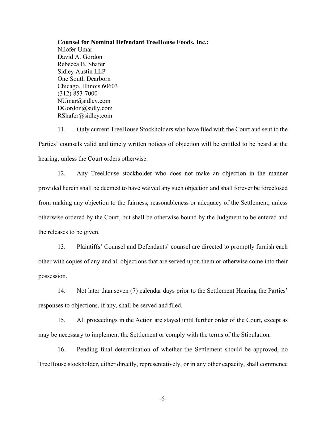 -6- Counsel for Nominal Defendant TreeHouse Foods, Inc.: Nilofer Umar David A. Gordon Rebecca B. Shafer Sidley Austin LLP One South Dearborn Chicago, Illinois 60603 (312) 853-7000 NUmar@sidley.com DGordon@sidly.com RShafer@sidley.com 11. Only current TreeHouse Stockholders who have filed with the Court and sent to the Parties’ counsels valid and timely written notices of objection will be entitled to be heard at the hearing, unless the Court orders otherwise. 12. Any TreeHouse stockholder who does not make an objection in the manner provided herein shall be deemed to have waived any such objection and shall forever be foreclosed from making any objection to the fairness, reasonableness or adequacy of the Settlement, unless otherwise ordered by the Court, but shall be otherwise bound by the Judgment to be entered and the releases to be given. 13. Plaintiffs’ Counsel and Defendants’ counsel are directed to promptly furnish each other with copies of any and all objections that are served upon them or otherwise come into their possession. 14. Not later than seven (7) calendar days prior to the Settlement Hearing the Parties’ responses to objections, if any, shall be served and filed. 15. All proceedings in the Action are stayed until further order of the Court, except as may be necessary to implement the Settlement or comply with the terms of the Stipulation. 16. Pending final determination of whether the Settlement should be approved, no TreeHouse stockholder, either directly, representatively, or in any other capacity, shall commence