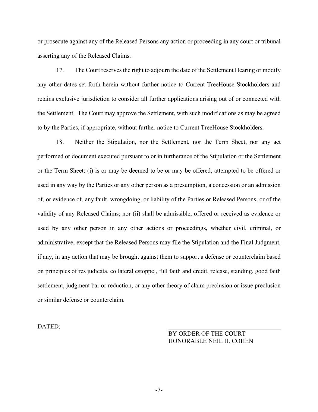 -7- or prosecute against any of the Released Persons any action or proceeding in any court or tribunal asserting any of the Released Claims. 17. The Court reserves the right to adjourn the date of the Settlement Hearing or modify any other dates set forth herein without further notice to Current TreeHouse Stockholders and retains exclusive jurisdiction to consider all further applications arising out of or connected with the Settlement. The Court may approve the Settlement, with such modifications as may be agreed to by the Parties, if appropriate, without further notice to Current TreeHouse Stockholders. 18. Neither the Stipulation, nor the Settlement, nor the Term Sheet, nor any act performed or document executed pursuant to or in furtherance of the Stipulation or the Settlement or the Term Sheet: (i) is or may be deemed to be or may be offered, attempted to be offered or used in any way by the Parties or any other person as a presumption, a concession or an admission of, or evidence of, any fault, wrongdoing, or liability of the Parties or Released Persons, or of the validity of any Released Claims; nor (ii) shall be admissible, offered or received as evidence or used by any other person in any other actions or proceedings, whether civil, criminal, or administrative, except that the Released Persons may file the Stipulation and the Final Judgment, if any, in any action that may be brought against them to support a defense or counterclaim based on principles of res judicata, collateral estoppel, full faith and credit, release, standing, good faith settlement, judgment bar or reduction, or any other theory of claim preclusion or issue preclusion or similar defense or counterclaim. DATED: BY ORDER OF THE COURT HONORABLE NEIL H. COHEN