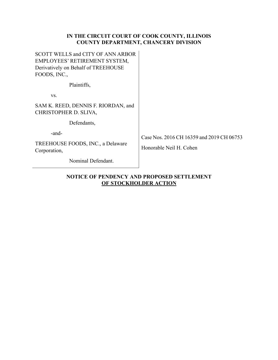 IN THE CIRCUIT COURT OF COOK COUNTY, ILLINOIS COUNTY DEPARTMENT, CHANCERY DIVISION SCOTT WELLS and CITY OF ANN ARBOR EMPLOYEES’ RETIREMENT SYSTEM, Derivatively on Behalf of TREEHOUSE FOODS, INC., Plaintiffs, vs. SAM K. REED, DENNIS F. RIORDAN, and CHRISTOPHER D. SLIVA, Defendants, -and- TREEHOUSE FOODS, INC., a Delaware Corporation, Nominal Defendant. Case Nos. 2016 CH 16359 and 2019 CH 06753 Honorable Neil H. Cohen NOTICE OF PENDENCY AND PROPOSED SETTLEMENT OF STOCKHOLDER ACTION