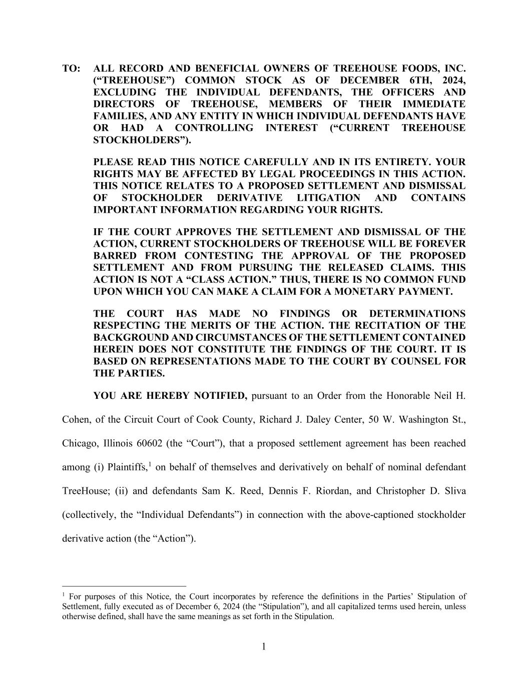 1 TO: ALL RECORD AND BENEFICIAL OWNERS OF TREEHOUSE FOODS, INC. (“TREEHOUSE”) COMMON STOCK AS OF DECEMBER 6TH, 2024, EXCLUDING THE INDIVIDUAL DEFENDANTS, THE OFFICERS AND DIRECTORS OF TREEHOUSE, MEMBERS OF THEIR IMMEDIATE FAMILIES, AND ANY ENTITY IN WHICH INDIVIDUAL DEFENDANTS HAVE OR HAD A CONTROLLING INTEREST (“CURRENT TREEHOUSE STOCKHOLDERS”). PLEASE READ THIS NOTICE CAREFULLY AND IN ITS ENTIRETY. YOUR RIGHTS MAY BE AFFECTED BY LEGAL PROCEEDINGS IN THIS ACTION. THIS NOTICE RELATES TO A PROPOSED SETTLEMENT AND DISMISSAL OF STOCKHOLDER DERIVATIVE LITIGATION AND CONTAINS IMPORTANT INFORMATION REGARDING YOUR RIGHTS. IF THE COURT APPROVES THE SETTLEMENT AND DISMISSAL OF THE ACTION, CURRENT STOCKHOLDERS OF TREEHOUSE WILL BE FOREVER BARRED FROM CONTESTING THE APPROVAL OF THE PROPOSED SETTLEMENT AND FROM PURSUING THE RELEASED CLAIMS. THIS ACTION IS NOT A “CLASS ACTION.” THUS, THERE IS NO COMMON FUND UPON WHICH YOU CAN MAKE A CLAIM FOR A MONETARY PAYMENT. THE COURT HAS MADE NO FINDINGS OR DETERMINATIONS RESPECTING THE MERITS OF THE ACTION. THE RECITATION OF THE BACKGROUND AND CIRCUMSTANCES OF THE SETTLEMENT CONTAINED HEREIN DOES NOT CONSTITUTE THE FINDINGS OF THE COURT. IT IS BASED ON REPRESENTATIONS MADE TO THE COURT BY COUNSEL FOR THE PARTIES. YOU ARE HEREBY NOTIFIED, pursuant to an Order from the Honorable Neil H. Cohen, of the Circuit Court of Cook County, Richard J. Daley Center, 50 W. Washington St., Chicago, Illinois 60602 (the “Court”), that a proposed settlement agreement has been reached among (i) Plaintiffs,1 on behalf of themselves and derivatively on behalf of nominal defendant TreeHouse; (ii) and defendants Sam K. Reed, Dennis F. Riordan, and Christopher D. Sliva (collectively, the “Individual Defendants”) in connection with the above-captioned stockholder derivative action (the “Action”). 1 For purposes of this Notice, the Court incorporates by reference the definitions in the Parties’ Stipulation of Settlement, fully executed as of December 6, 2024 (the “Stipulation”), and all capitalized terms used herein, unless otherwise defined, shall have the same meanings as set forth in the Stipulation.