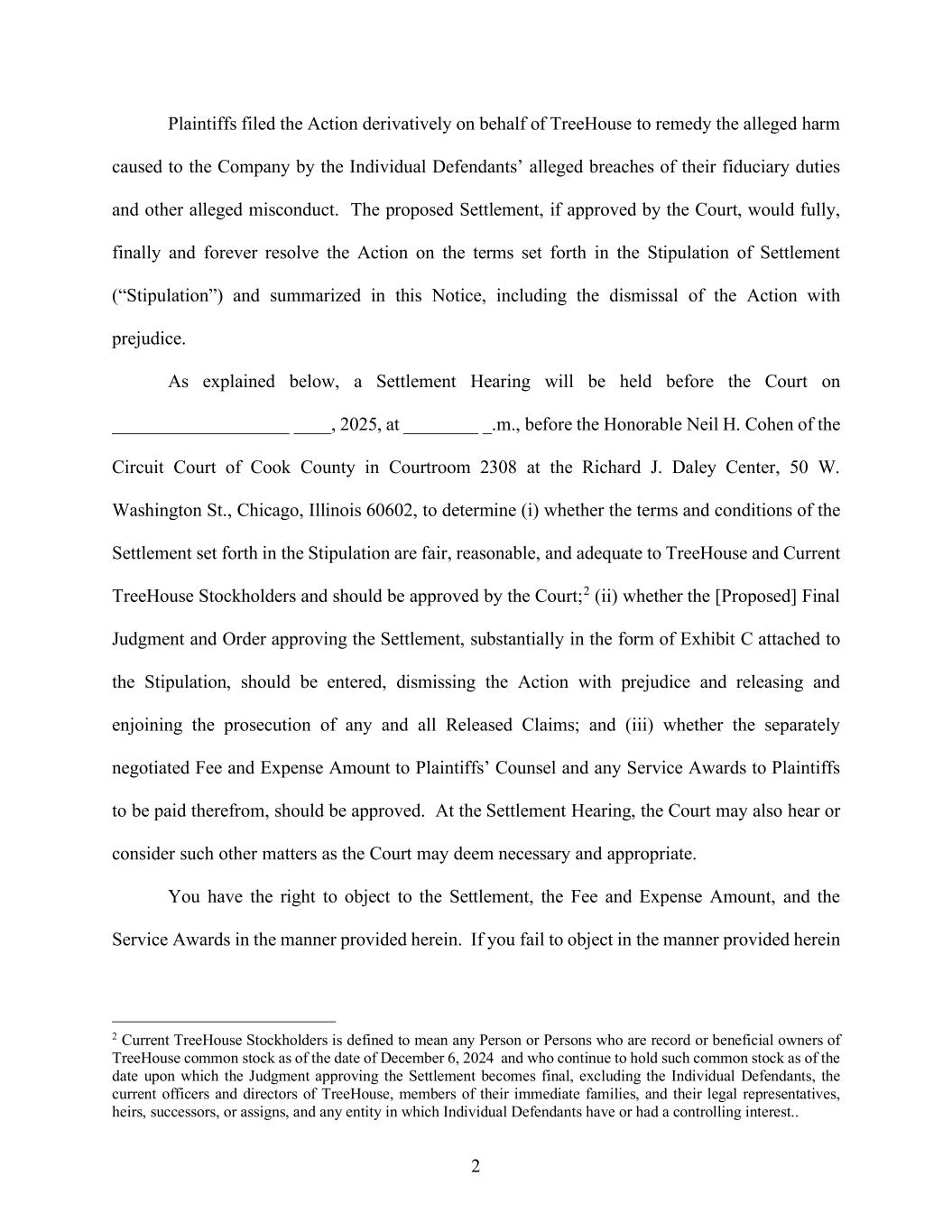 2 Plaintiffs filed the Action derivatively on behalf of TreeHouse to remedy the alleged harm caused to the Company by the Individual Defendants’ alleged breaches of their fiduciary duties and other alleged misconduct. The proposed Settlement, if approved by the Court, would fully, finally and forever resolve the Action on the terms set forth in the Stipulation of Settlement (“Stipulation”) and summarized in this Notice, including the dismissal of the Action with prejudice. As explained below, a Settlement Hearing will be held before the Court on ___________________ ____, 2025, at ________ _.m., before the Honorable Neil H. Cohen of the Circuit Court of Cook County in Courtroom 2308 at the Richard J. Daley Center, 50 W. Washington St., Chicago, Illinois 60602, to determine (i) whether the terms and conditions of the Settlement set forth in the Stipulation are fair, reasonable, and adequate to TreeHouse and Current TreeHouse Stockholders and should be approved by the Court;2 (ii) whether the [Proposed] Final Judgment and Order approving the Settlement, substantially in the form of Exhibit C attached to the Stipulation, should be entered, dismissing the Action with prejudice and releasing and enjoining the prosecution of any and all Released Claims; and (iii) whether the separately negotiated Fee and Expense Amount to Plaintiffs’ Counsel and any Service Awards to Plaintiffs to be paid therefrom, should be approved. At the Settlement Hearing, the Court may also hear or consider such other matters as the Court may deem necessary and appropriate. You have the right to object to the Settlement, the Fee and Expense Amount, and the Service Awards in the manner provided herein. If you fail to object in the manner provided herein 2 Current TreeHouse Stockholders is defined to mean any Person or Persons who are record or beneficial owners of TreeHouse common stock as of the date of December 6, 2024 and who continue to hold such common stock as of the date upon which the Judgment approving the Settlement becomes final, excluding the Individual Defendants, the current officers and directors of TreeHouse, members of their immediate families, and their legal representatives, heirs, successors, or assigns, and any entity in which Individual Defendants have or had a controlling interest..