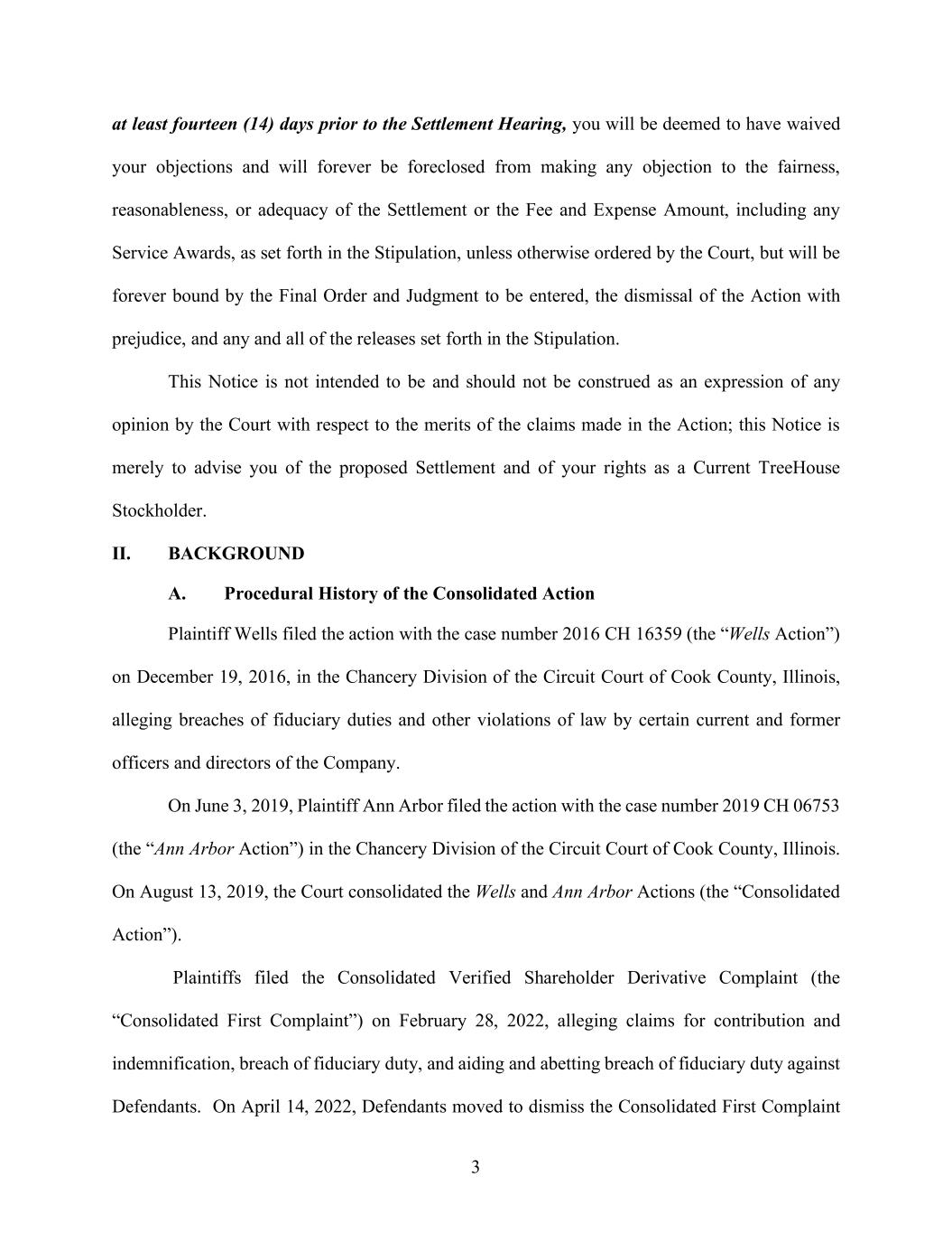 3 at least fourteen (14) days prior to the Settlement Hearing, you will be deemed to have waived your objections and will forever be foreclosed from making any objection to the fairness, reasonableness, or adequacy of the Settlement or the Fee and Expense Amount, including any Service Awards, as set forth in the Stipulation, unless otherwise ordered by the Court, but will be forever bound by the Final Order and Judgment to be entered, the dismissal of the Action with prejudice, and any and all of the releases set forth in the Stipulation. This Notice is not intended to be and should not be construed as an expression of any opinion by the Court with respect to the merits of the claims made in the Action; this Notice is merely to advise you of the proposed Settlement and of your rights as a Current TreeHouse Stockholder. II. BACKGROUND A. Procedural History of the Consolidated Action Plaintiff Wells filed the action with the case number 2016 CH 16359 (the “Wells Action”) on December 19, 2016, in the Chancery Division of the Circuit Court of Cook County, Illinois, alleging breaches of fiduciary duties and other violations of law by certain current and former officers and directors of the Company. On June 3, 2019, Plaintiff Ann Arbor filed the action with the case number 2019 CH 06753 (the “Ann Arbor Action”) in the Chancery Division of the Circuit Court of Cook County, Illinois. On August 13, 2019, the Court consolidated the Wells and Ann Arbor Actions (the “Consolidated Action”). Plaintiffs filed the Consolidated Verified Shareholder Derivative Complaint (the “Consolidated First Complaint”) on February 28, 2022, alleging claims for contribution and indemnification, breach of fiduciary duty, and aiding and abetting breach of fiduciary duty against Defendants. On April 14, 2022, Defendants moved to dismiss the Consolidated First Complaint