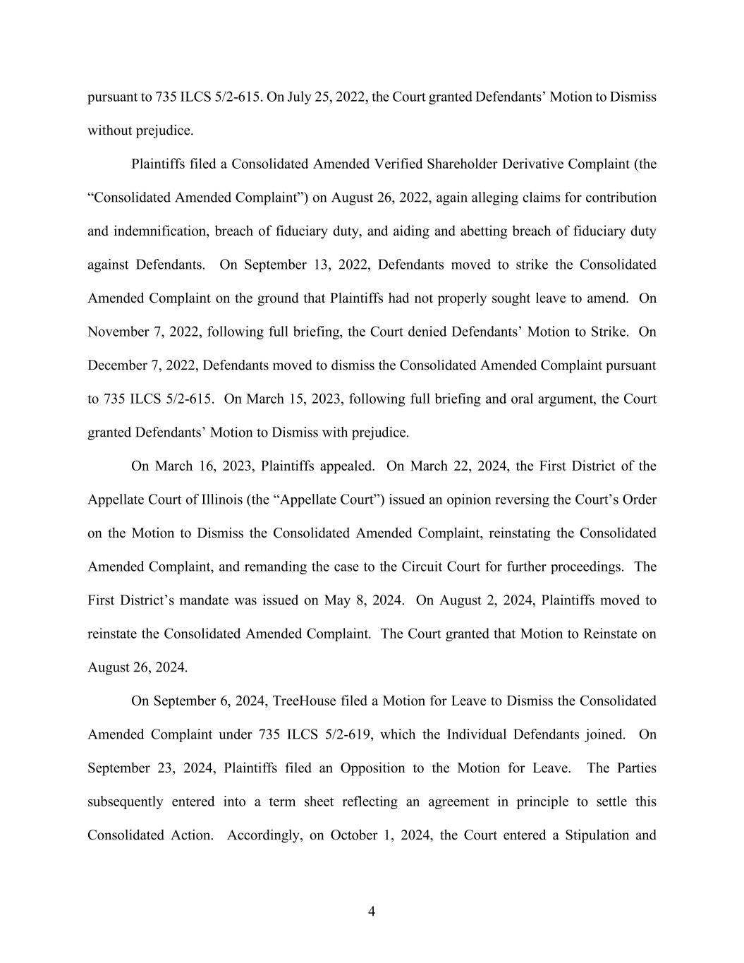 4 pursuant to 735 ILCS 5/2-615. On July 25, 2022, the Court granted Defendants’ Motion to Dismiss without prejudice. Plaintiffs filed a Consolidated Amended Verified Shareholder Derivative Complaint (the “Consolidated Amended Complaint”) on August 26, 2022, again alleging claims for contribution and indemnification, breach of fiduciary duty, and aiding and abetting breach of fiduciary duty against Defendants. On September 13, 2022, Defendants moved to strike the Consolidated Amended Complaint on the ground that Plaintiffs had not properly sought leave to amend. On November 7, 2022, following full briefing, the Court denied Defendants’ Motion to Strike. On December 7, 2022, Defendants moved to dismiss the Consolidated Amended Complaint pursuant to 735 ILCS 5/2-615. On March 15, 2023, following full briefing and oral argument, the Court granted Defendants’ Motion to Dismiss with prejudice. On March 16, 2023, Plaintiffs appealed. On March 22, 2024, the First District of the Appellate Court of Illinois (the “Appellate Court”) issued an opinion reversing the Court’s Order on the Motion to Dismiss the Consolidated Amended Complaint, reinstating the Consolidated Amended Complaint, and remanding the case to the Circuit Court for further proceedings. The First District’s mandate was issued on May 8, 2024. On August 2, 2024, Plaintiffs moved to reinstate the Consolidated Amended Complaint. The Court granted that Motion to Reinstate on August 26, 2024. On September 6, 2024, TreeHouse filed a Motion for Leave to Dismiss the Consolidated Amended Complaint under 735 ILCS 5/2-619, which the Individual Defendants joined. On September 23, 2024, Plaintiffs filed an Opposition to the Motion for Leave. The Parties subsequently entered into a term sheet reflecting an agreement in principle to settle this Consolidated Action. Accordingly, on October 1, 2024, the Court entered a Stipulation and