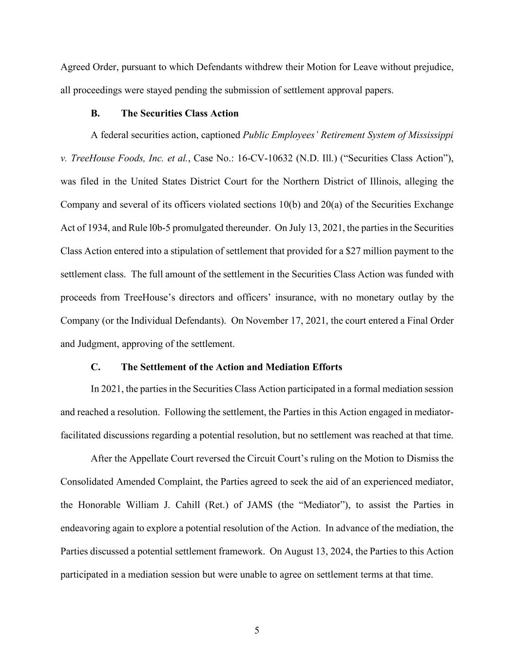 5 Agreed Order, pursuant to which Defendants withdrew their Motion for Leave without prejudice, all proceedings were stayed pending the submission of settlement approval papers. B. The Securities Class Action A federal securities action, captioned Public Employees’ Retirement System of Mississippi v. TreeHouse Foods, Inc. et al., Case No.: 16-CV-10632 (N.D. Ill.) (“Securities Class Action”), was filed in the United States District Court for the Northern District of Illinois, alleging the Company and several of its officers violated sections 10(b) and 20(a) of the Securities Exchange Act of 1934, and Rule l0b-5 promulgated thereunder. On July 13, 2021, the parties in the Securities Class Action entered into a stipulation of settlement that provided for a $27 million payment to the settlement class. The full amount of the settlement in the Securities Class Action was funded with proceeds from TreeHouse’s directors and officers’ insurance, with no monetary outlay by the Company (or the Individual Defendants). On November 17, 2021, the court entered a Final Order and Judgment, approving of the settlement. C. The Settlement of the Action and Mediation Efforts In 2021, the parties in the Securities Class Action participated in a formal mediation session and reached a resolution. Following the settlement, the Parties in this Action engaged in mediator- facilitated discussions regarding a potential resolution, but no settlement was reached at that time. After the Appellate Court reversed the Circuit Court’s ruling on the Motion to Dismiss the Consolidated Amended Complaint, the Parties agreed to seek the aid of an experienced mediator, the Honorable William J. Cahill (Ret.) of JAMS (the “Mediator”), to assist the Parties in endeavoring again to explore a potential resolution of the Action. In advance of the mediation, the Parties discussed a potential settlement framework. On August 13, 2024, the Parties to this Action participated in a mediation session but were unable to agree on settlement terms at that time.