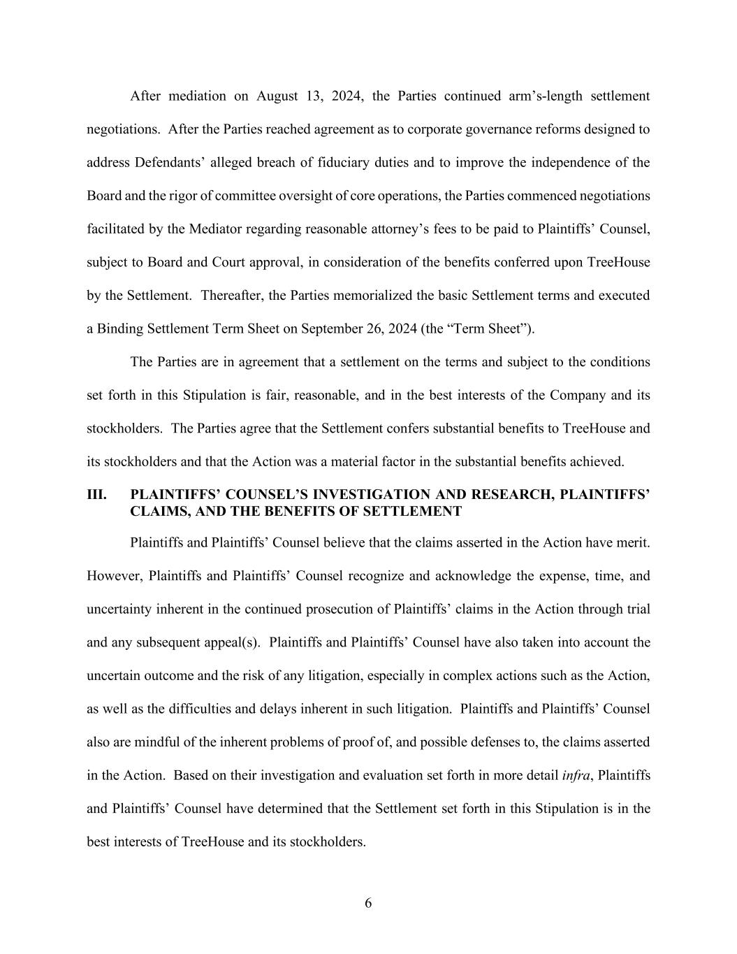 6 After mediation on August 13, 2024, the Parties continued arm’s-length settlement negotiations. After the Parties reached agreement as to corporate governance reforms designed to address Defendants’ alleged breach of fiduciary duties and to improve the independence of the Board and the rigor of committee oversight of core operations, the Parties commenced negotiations facilitated by the Mediator regarding reasonable attorney’s fees to be paid to Plaintiffs’ Counsel, subject to Board and Court approval, in consideration of the benefits conferred upon TreeHouse by the Settlement. Thereafter, the Parties memorialized the basic Settlement terms and executed a Binding Settlement Term Sheet on September 26, 2024 (the “Term Sheet”). The Parties are in agreement that a settlement on the terms and subject to the conditions set forth in this Stipulation is fair, reasonable, and in the best interests of the Company and its stockholders. The Parties agree that the Settlement confers substantial benefits to TreeHouse and its stockholders and that the Action was a material factor in the substantial benefits achieved. III. PLAINTIFFS’ COUNSEL’S INVESTIGATION AND RESEARCH, PLAINTIFFS’ CLAIMS, AND THE BENEFITS OF SETTLEMENT Plaintiffs and Plaintiffs’ Counsel believe that the claims asserted in the Action have merit. However, Plaintiffs and Plaintiffs’ Counsel recognize and acknowledge the expense, time, and uncertainty inherent in the continued prosecution of Plaintiffs’ claims in the Action through trial and any subsequent appeal(s). Plaintiffs and Plaintiffs’ Counsel have also taken into account the uncertain outcome and the risk of any litigation, especially in complex actions such as the Action, as well as the difficulties and delays inherent in such litigation. Plaintiffs and Plaintiffs’ Counsel also are mindful of the inherent problems of proof of, and possible defenses to, the claims asserted in the Action. Based on their investigation and evaluation set forth in more detail infra, Plaintiffs and Plaintiffs’ Counsel have determined that the Settlement set forth in this Stipulation is in the best interests of TreeHouse and its stockholders.