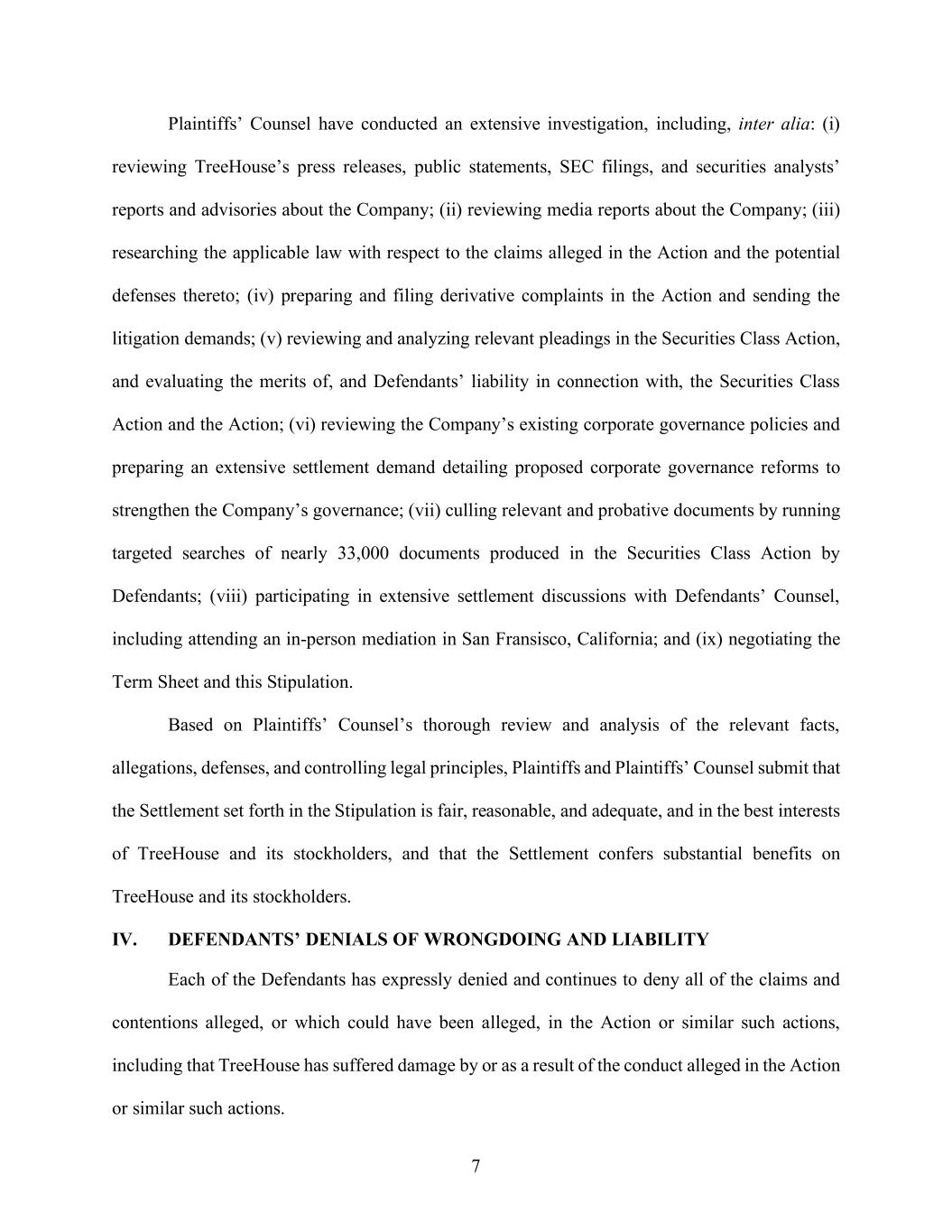 7 Plaintiffs’ Counsel have conducted an extensive investigation, including, inter alia: (i) reviewing TreeHouse’s press releases, public statements, SEC filings, and securities analysts’ reports and advisories about the Company; (ii) reviewing media reports about the Company; (iii) researching the applicable law with respect to the claims alleged in the Action and the potential defenses thereto; (iv) preparing and filing derivative complaints in the Action and sending the litigation demands; (v) reviewing and analyzing relevant pleadings in the Securities Class Action, and evaluating the merits of, and Defendants’ liability in connection with, the Securities Class Action and the Action; (vi) reviewing the Company’s existing corporate governance policies and preparing an extensive settlement demand detailing proposed corporate governance reforms to strengthen the Company’s governance; (vii) culling relevant and probative documents by running targeted searches of nearly 33,000 documents produced in the Securities Class Action by Defendants; (viii) participating in extensive settlement discussions with Defendants’ Counsel, including attending an in-person mediation in San Fransisco, California; and (ix) negotiating the Term Sheet and this Stipulation. Based on Plaintiffs’ Counsel’s thorough review and analysis of the relevant facts, allegations, defenses, and controlling legal principles, Plaintiffs and Plaintiffs’ Counsel submit that the Settlement set forth in the Stipulation is fair, reasonable, and adequate, and in the best interests of TreeHouse and its stockholders, and that the Settlement confers substantial benefits on TreeHouse and its stockholders. IV. DEFENDANTS’ DENIALS OF WRONGDOING AND LIABILITY Each of the Defendants has expressly denied and continues to deny all of the claims and contentions alleged, or which could have been alleged, in the Action or similar such actions, including that TreeHouse has suffered damage by or as a result of the conduct alleged in the Action or similar such actions.