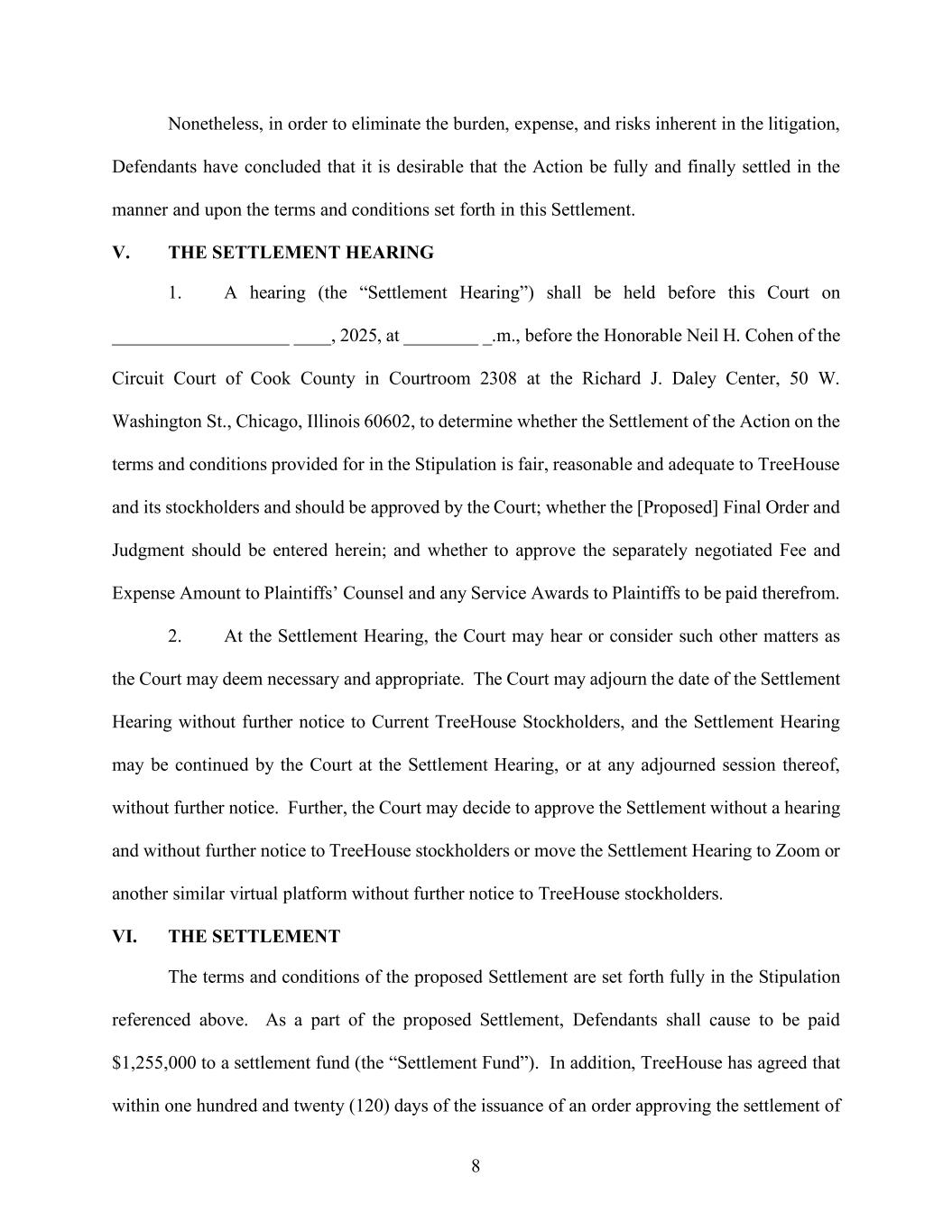 8 Nonetheless, in order to eliminate the burden, expense, and risks inherent in the litigation, Defendants have concluded that it is desirable that the Action be fully and finally settled in the manner and upon the terms and conditions set forth in this Settlement. V. THE SETTLEMENT HEARING 1. A hearing (the “Settlement Hearing”) shall be held before this Court on ___________________ ____, 2025, at ________ _.m., before the Honorable Neil H. Cohen of the Circuit Court of Cook County in Courtroom 2308 at the Richard J. Daley Center, 50 W. Washington St., Chicago, Illinois 60602, to determine whether the Settlement of the Action on the terms and conditions provided for in the Stipulation is fair, reasonable and adequate to TreeHouse and its stockholders and should be approved by the Court; whether the [Proposed] Final Order and Judgment should be entered herein; and whether to approve the separately negotiated Fee and Expense Amount to Plaintiffs’ Counsel and any Service Awards to Plaintiffs to be paid therefrom. 2. At the Settlement Hearing, the Court may hear or consider such other matters as the Court may deem necessary and appropriate. The Court may adjourn the date of the Settlement Hearing without further notice to Current TreeHouse Stockholders, and the Settlement Hearing may be continued by the Court at the Settlement Hearing, or at any adjourned session thereof, without further notice. Further, the Court may decide to approve the Settlement without a hearing and without further notice to TreeHouse stockholders or move the Settlement Hearing to Zoom or another similar virtual platform without further notice to TreeHouse stockholders. VI. THE SETTLEMENT The terms and conditions of the proposed Settlement are set forth fully in the Stipulation referenced above. As a part of the proposed Settlement, Defendants shall cause to be paid $1,255,000 to a settlement fund (the “Settlement Fund”). In addition, TreeHouse has agreed that within one hundred and twenty (120) days of the issuance of an order approving the settlement of