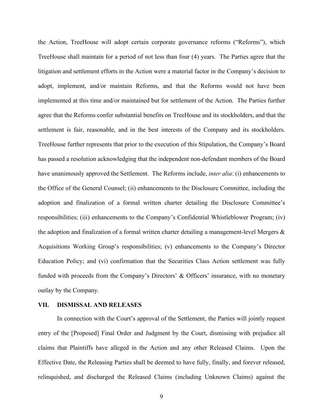 9 the Action, TreeHouse will adopt certain corporate governance reforms (“Reforms”), which TreeHouse shall maintain for a period of not less than four (4) years. The Parties agree that the litigation and settlement efforts in the Action were a material factor in the Company’s decision to adopt, implement, and/or maintain Reforms, and that the Reforms would not have been implemented at this time and/or maintained but for settlement of the Action. The Parties further agree that the Reforms confer substantial benefits on TreeHouse and its stockholders, and that the settlement is fair, reasonable, and in the best interests of the Company and its stockholders. TreeHouse further represents that prior to the execution of this Stipulation, the Company’s Board has passed a resolution acknowledging that the independent non-defendant members of the Board have unanimously approved the Settlement. The Reforms include, inter alia: (i) enhancements to the Office of the General Counsel; (ii) enhancements to the Disclosure Committee, including the adoption and finalization of a formal written charter detailing the Disclosure Committee’s responsibilities; (iii) enhancements to the Company’s Confidential Whistleblower Program; (iv) the adoption and finalization of a formal written charter detailing a management-level Mergers & Acquisitions Working Group’s responsibilities; (v) enhancements to the Company’s Director Education Policy; and (vi) confirmation that the Securities Class Action settlement was fully funded with proceeds from the Company’s Directors’ & Officers’ insurance, with no monetary outlay by the Company. VII. DISMISSAL AND RELEASES In connection with the Court’s approval of the Settlement, the Parties will jointly request entry of the [Proposed] Final Order and Judgment by the Court, dismissing with prejudice all claims that Plaintiffs have alleged in the Action and any other Released Claims. Upon the Effective Date, the Releasing Parties shall be deemed to have fully, finally, and forever released, relinquished, and discharged the Released Claims (including Unknown Claims) against the