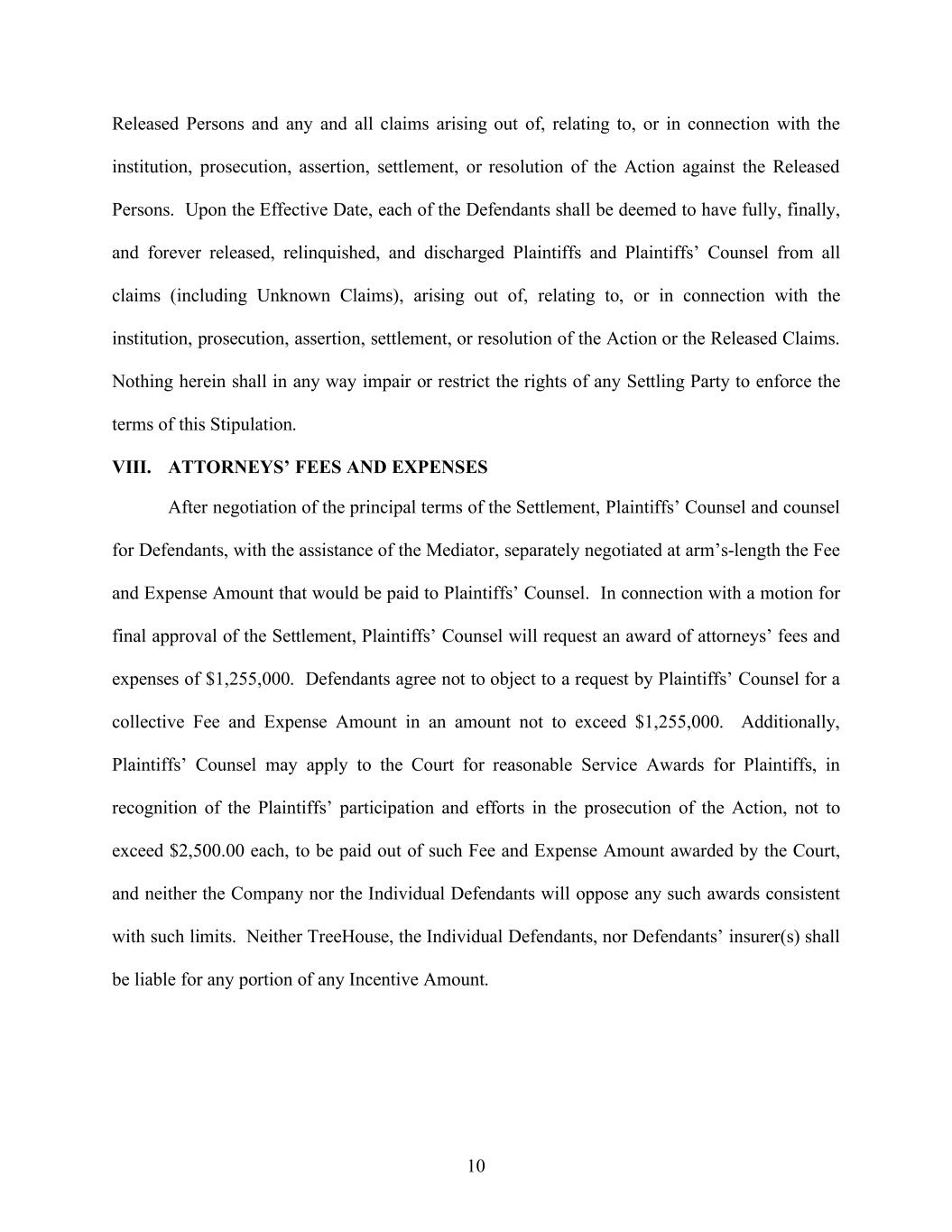 10 Released Persons and any and all claims arising out of, relating to, or in connection with the institution, prosecution, assertion, settlement, or resolution of the Action against the Released Persons. Upon the Effective Date, each of the Defendants shall be deemed to have fully, finally, and forever released, relinquished, and discharged Plaintiffs and Plaintiffs’ Counsel from all claims (including Unknown Claims), arising out of, relating to, or in connection with the institution, prosecution, assertion, settlement, or resolution of the Action or the Released Claims. Nothing herein shall in any way impair or restrict the rights of any Settling Party to enforce the terms of this Stipulation. VIII. ATTORNEYS’ FEES AND EXPENSES After negotiation of the principal terms of the Settlement, Plaintiffs’ Counsel and counsel for Defendants, with the assistance of the Mediator, separately negotiated at arm’s-length the Fee and Expense Amount that would be paid to Plaintiffs’ Counsel. In connection with a motion for final approval of the Settlement, Plaintiffs’ Counsel will request an award of attorneys’ fees and expenses of $1,255,000. Defendants agree not to object to a request by Plaintiffs’ Counsel for a collective Fee and Expense Amount in an amount not to exceed $1,255,000. Additionally, Plaintiffs’ Counsel may apply to the Court for reasonable Service Awards for Plaintiffs, in recognition of the Plaintiffs’ participation and efforts in the prosecution of the Action, not to exceed $2,500.00 each, to be paid out of such Fee and Expense Amount awarded by the Court, and neither the Company nor the Individual Defendants will oppose any such awards consistent with such limits. Neither TreeHouse, the Individual Defendants, nor Defendants’ insurer(s) shall be liable for any portion of any Incentive Amount.