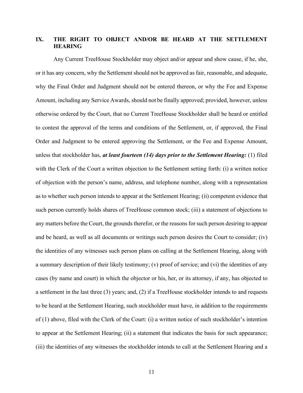 11 IX. THE RIGHT TO OBJECT AND/OR BE HEARD AT THE SETTLEMENT HEARING Any Current TreeHouse Stockholder may object and/or appear and show cause, if he, she, or it has any concern, why the Settlement should not be approved as fair, reasonable, and adequate, why the Final Order and Judgment should not be entered thereon, or why the Fee and Expense Amount, including any Service Awards, should not be finally approved; provided, however, unless otherwise ordered by the Court, that no Current TreeHouse Stockholder shall be heard or entitled to contest the approval of the terms and conditions of the Settlement, or, if approved, the Final Order and Judgment to be entered approving the Settlement, or the Fee and Expense Amount, unless that stockholder has, at least fourteen (14) days prior to the Settlement Hearing: (1) filed with the Clerk of the Court a written objection to the Settlement setting forth: (i) a written notice of objection with the person’s name, address, and telephone number, along with a representation as to whether such person intends to appear at the Settlement Hearing; (ii) competent evidence that such person currently holds shares of TreeHouse common stock; (iii) a statement of objections to any matters before the Court, the grounds therefor, or the reasons for such person desiring to appear and be heard, as well as all documents or writings such person desires the Court to consider; (iv) the identities of any witnesses such person plans on calling at the Settlement Hearing, along with a summary description of their likely testimony; (v) proof of service; and (vi) the identities of any cases (by name and court) in which the objector or his, her, or its attorney, if any, has objected to a settlement in the last three (3) years; and, (2) if a TreeHouse stockholder intends to and requests to be heard at the Settlement Hearing, such stockholder must have, in addition to the requirements of (1) above, filed with the Clerk of the Court: (i) a written notice of such stockholder’s intention to appear at the Settlement Hearing; (ii) a statement that indicates the basis for such appearance; (iii) the identities of any witnesses the stockholder intends to call at the Settlement Hearing and a