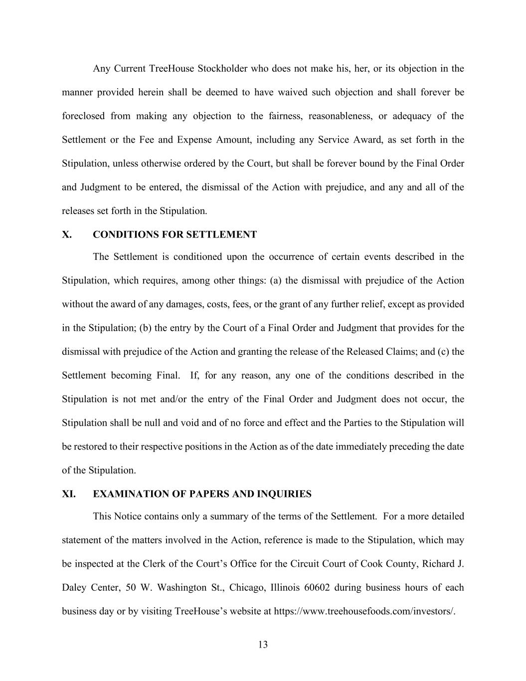 13 Any Current TreeHouse Stockholder who does not make his, her, or its objection in the manner provided herein shall be deemed to have waived such objection and shall forever be foreclosed from making any objection to the fairness, reasonableness, or adequacy of the Settlement or the Fee and Expense Amount, including any Service Award, as set forth in the Stipulation, unless otherwise ordered by the Court, but shall be forever bound by the Final Order and Judgment to be entered, the dismissal of the Action with prejudice, and any and all of the releases set forth in the Stipulation. X. CONDITIONS FOR SETTLEMENT The Settlement is conditioned upon the occurrence of certain events described in the Stipulation, which requires, among other things: (a) the dismissal with prejudice of the Action without the award of any damages, costs, fees, or the grant of any further relief, except as provided in the Stipulation; (b) the entry by the Court of a Final Order and Judgment that provides for the dismissal with prejudice of the Action and granting the release of the Released Claims; and (c) the Settlement becoming Final. If, for any reason, any one of the conditions described in the Stipulation is not met and/or the entry of the Final Order and Judgment does not occur, the Stipulation shall be null and void and of no force and effect and the Parties to the Stipulation will be restored to their respective positions in the Action as of the date immediately preceding the date of the Stipulation. XI. EXAMINATION OF PAPERS AND INQUIRIES This Notice contains only a summary of the terms of the Settlement. For a more detailed statement of the matters involved in the Action, reference is made to the Stipulation, which may be inspected at the Clerk of the Court’s Office for the Circuit Court of Cook County, Richard J. Daley Center, 50 W. Washington St., Chicago, Illinois 60602 during business hours of each business day or by visiting TreeHouse’s website at https://www.treehousefoods.com/investors/.