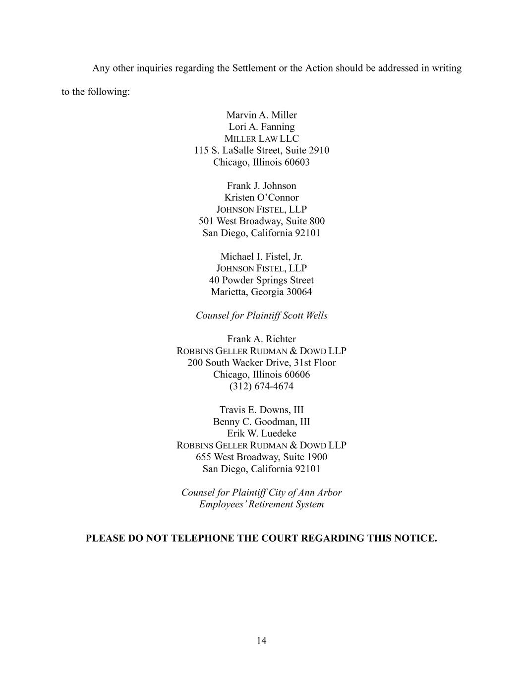 14 Any other inquiries regarding the Settlement or the Action should be addressed in writing to the following: Marvin A. Miller Lori A. Fanning MILLER LAW LLC 115 S. LaSalle Street, Suite 2910 Chicago, Illinois 60603 Frank J. Johnson Kristen O’Connor JOHNSON FISTEL, LLP 501 West Broadway, Suite 800 San Diego, California 92101 Michael I. Fistel, Jr. JOHNSON FISTEL, LLP 40 Powder Springs Street Marietta, Georgia 30064 Counsel for Plaintiff Scott Wells Frank A. Richter ROBBINS GELLER RUDMAN & DOWD LLP 200 South Wacker Drive, 31st Floor Chicago, Illinois 60606 (312) 674-4674 Travis E. Downs, III Benny C. Goodman, III Erik W. Luedeke ROBBINS GELLER RUDMAN & DOWD LLP 655 West Broadway, Suite 1900 San Diego, California 92101 Counsel for Plaintiff City of Ann Arbor Employees’ Retirement System PLEASE DO NOT TELEPHONE THE COURT REGARDING THIS NOTICE.