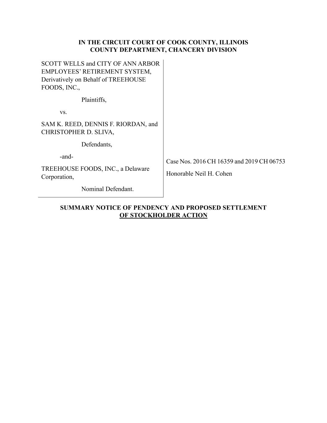 IN THE CIRCUIT COURT OF COOK COUNTY, ILLINOIS COUNTY DEPARTMENT, CHANCERY DIVISION SCOTT WELLS and CITY OF ANN ARBOR EMPLOYEES’ RETIREMENT SYSTEM, Derivatively on Behalf of TREEHOUSE FOODS, INC., Plaintiffs, vs. SAM K. REED, DENNIS F. RIORDAN, and CHRISTOPHER D. SLIVA, Defendants, -and- TREEHOUSE FOODS, INC., a Delaware Corporation, Nominal Defendant. Case Nos. 2016 CH 16359 and 2019 CH 06753 Honorable Neil H. Cohen SUMMARY NOTICE OF PENDENCY AND PROPOSED SETTLEMENT OF STOCKHOLDER ACTION