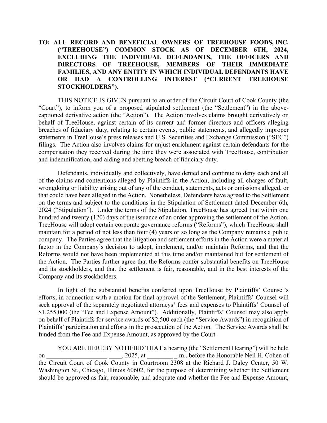 TO: ALL RECORD AND BENEFICIAL OWNERS OF TREEHOUSE FOODS, INC. (“TREEHOUSE”) COMMON STOCK AS OF DECEMBER 6TH, 2024, EXCLUDING THE INDIVIDUAL DEFENDANTS, THE OFFICERS AND DIRECTORS OF TREEHOUSE, MEMBERS OF THEIR IMMEDIATE FAMILIES, AND ANY ENTITY IN WHICH INDIVIDUAL DEFENDANTS HAVE OR HAD A CONTROLLING INTEREST (“CURRENT TREEHOUSE STOCKHOLDERS”). THIS NOTICE IS GIVEN pursuant to an order of the Circuit Court of Cook County (the “Court”), to inform you of a proposed stipulated settlement (the “Settlement”) in the above- captioned derivative action (the “Action”). The Action involves claims brought derivatively on behalf of TreeHouse, against certain of its current and former directors and officers alleging breaches of fiduciary duty, relating to certain events, public statements, and allegedly improper statements in TreeHouse’s press releases and U.S. Securities and Exchange Commission (“SEC”) filings. The Action also involves claims for unjust enrichment against certain defendants for the compensation they received during the time they were associated with TreeHouse, contribution and indemnification, and aiding and abetting breach of fiduciary duty. Defendants, individually and collectively, have denied and continue to deny each and all of the claims and contentions alleged by Plaintiffs in the Action, including all charges of fault, wrongdoing or liability arising out of any of the conduct, statements, acts or omissions alleged, or that could have been alleged in the Action. Nonetheless, Defendants have agreed to the Settlement on the terms and subject to the conditions in the Stipulation of Settlement dated December 6th, 2024 (“Stipulation”). Under the terms of the Stipulation, TreeHouse has agreed that within one hundred and twenty (120) days of the issuance of an order approving the settlement of the Action, TreeHouse will adopt certain corporate governance reforms (“Reforms”), which TreeHouse shall maintain for a period of not less than four (4) years or so long as the Company remains a public company. The Parties agree that the litigation and settlement efforts in the Action were a material factor in the Company’s decision to adopt, implement, and/or maintain Reforms, and that the Reforms would not have been implemented at this time and/or maintained but for settlement of the Action. The Parties further agree that the Reforms confer substantial benefits on TreeHouse and its stockholders, and that the settlement is fair, reasonable, and in the best interests of the Company and its stockholders. In light of the substantial benefits conferred upon TreeHouse by Plaintiffs’ Counsel’s efforts, in connection with a motion for final approval of the Settlement, Plaintiffs’ Counsel will seek approval of the separately negotiated attorneys’ fees and expenses to Plaintiffs’ Counsel of $1,255,000 (the “Fee and Expense Amount”). Additionally, Plaintiffs’ Counsel may also apply on behalf of Plaintiffs for service awards of $2,500 each (the “Service Awards”) in recognition of Plaintiffs’ participation and efforts in the prosecution of the Action. The Service Awards shall be funded from the Fee and Expense Amount, as approved by the Court. YOU ARE HEREBY NOTIFIED THAT a hearing (the “Settlement Hearing”) will be held on ___________________ ____, 2025, at ________ _.m., before the Honorable Neil H. Cohen of the Circuit Court of Cook County in Courtroom 2308 at the Richard J. Daley Center, 50 W. Washington St., Chicago, Illinois 60602, for the purpose of determining whether the Settlement should be approved as fair, reasonable, and adequate and whether the Fee and Expense Amount,
