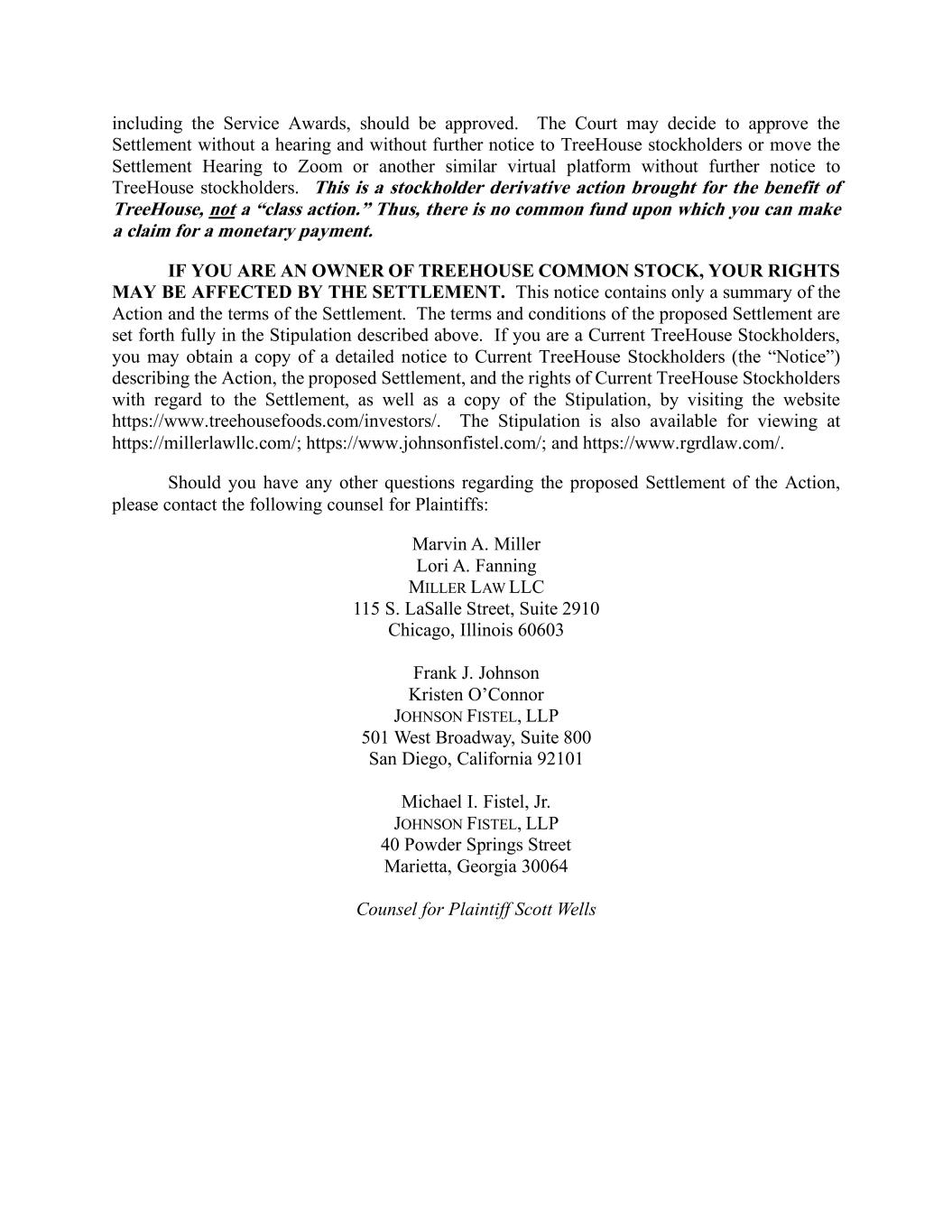 including the Service Awards, should be approved. The Court may decide to approve the Settlement without a hearing and without further notice to TreeHouse stockholders or move the Settlement Hearing to Zoom or another similar virtual platform without further notice to TreeHouse stockholders. This is a stockholder derivative action brought for the benefit of TreeHouse, not a “class action.” Thus, there is no common fund upon which you can make a claim for a monetary payment. IF YOU ARE AN OWNER OF TREEHOUSE COMMON STOCK, YOUR RIGHTS MAY BE AFFECTED BY THE SETTLEMENT. This notice contains only a summary of the Action and the terms of the Settlement. The terms and conditions of the proposed Settlement are set forth fully in the Stipulation described above. If you are a Current TreeHouse Stockholders, you may obtain a copy of a detailed notice to Current TreeHouse Stockholders (the “Notice”) describing the Action, the proposed Settlement, and the rights of Current TreeHouse Stockholders with regard to the Settlement, as well as a copy of the Stipulation, by visiting the website https://www.treehousefoods.com/investors/. The Stipulation is also available for viewing at https://millerlawllc.com/; https://www.johnsonfistel.com/; and https://www.rgrdlaw.com/. Should you have any other questions regarding the proposed Settlement of the Action, please contact the following counsel for Plaintiffs: Marvin A. Miller Lori A. Fanning MILLER LAW LLC 115 S. LaSalle Street, Suite 2910 Chicago, Illinois 60603 Frank J. Johnson Kristen O’Connor JOHNSON FISTEL, LLP 501 West Broadway, Suite 800 San Diego, California 92101 Michael I. Fistel, Jr. JOHNSON FISTEL, LLP 40 Powder Springs Street Marietta, Georgia 30064 Counsel for Plaintiff Scott Wells